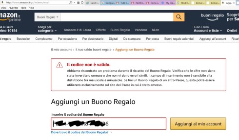 Il codice Amazon generato non è inseribile con le modalità classiche di inserimento di un Buono Regalo