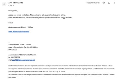 Sempre come specificato nelle istruzioni presenti sul sito di Abbonamento Musei Piemonte, si deve quindi inviare una email ad app18@abbonamentomusei.it indicando: