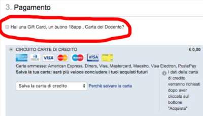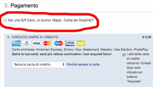 Selezionare come metodo di acquisto quello di una carta di credito e NON di un buono regalo se si desidera scalare da un importo di un buono 18app un acquisto compatibile (2)