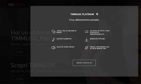 • Se sei un cliente TIM con TIM BOX entrando in app da TV, dal 1° al 28 Febbraio , sarai riconosciuto in automatico con il profilo Platinum gratis. Se vuoi utilizzare il profilo su altri dispositivi entra in http://www.timmusic.it e registrati associando il tuo numero di linea fissa.