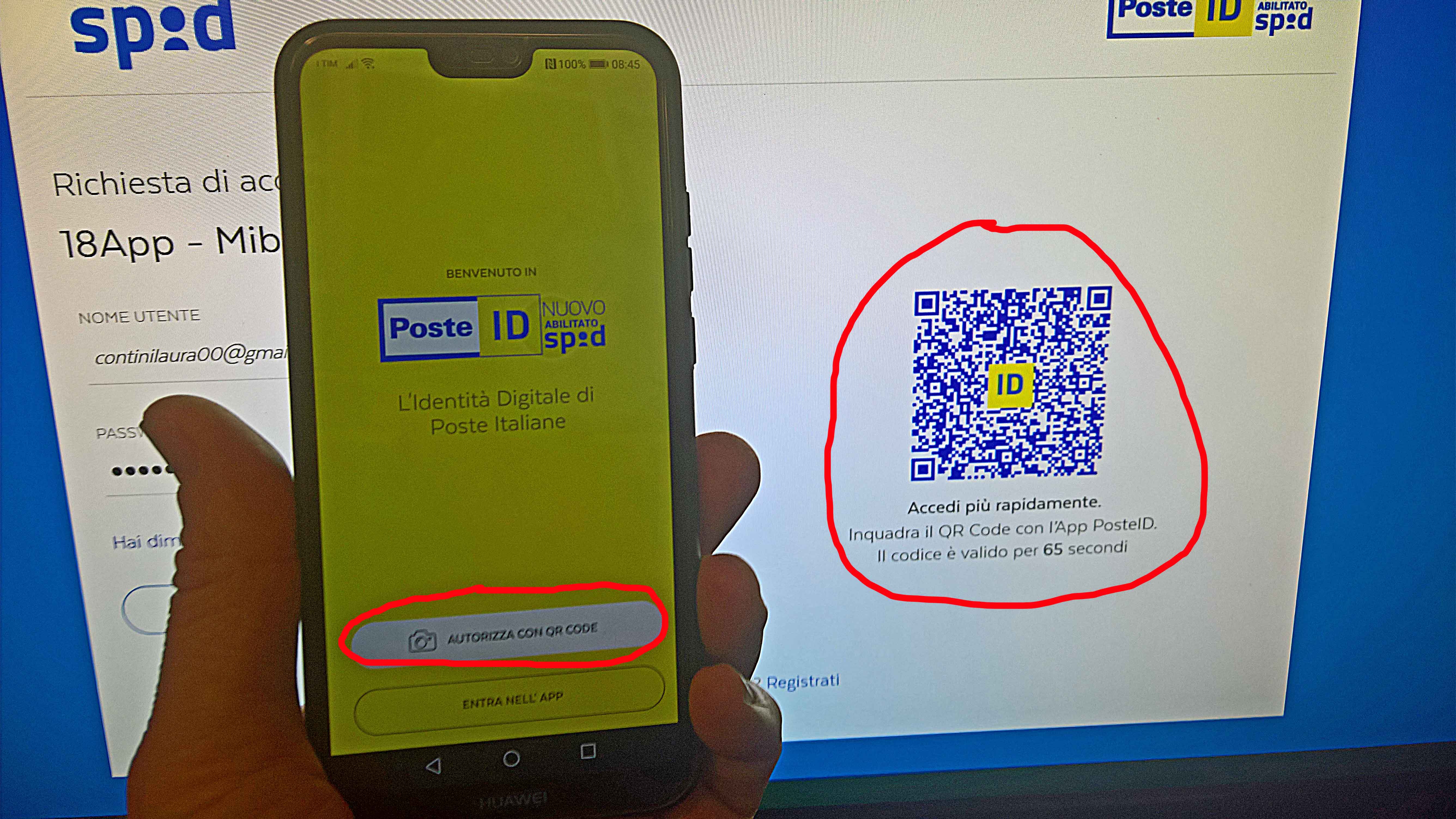 La modalità più semplice per eseguire l’accesso è quella di lanciare l’app PosteID sul telefonino, premere il suo pulsante Autorizza con QR code e puntare quindi l’immagine visualizzata sul QR code(immagine quadrata a puntini) mostrato a destra nella pagina del sito 18app.