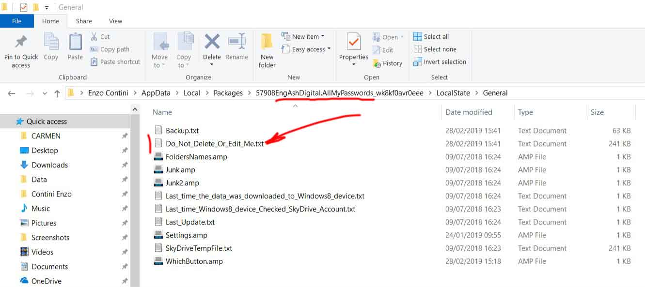 Then if you want to explore the data of a specific app, you have to search the associated subdirectory (e.g. 57908EngAshDigital.AllMyPasswords_wk8kf0avr0eee for the app AllMyPassword of EngAshDigital). For that specific app, the searched backup data are in the Do_Not_Delete_Or_Edit_Me.txt file, the file with the same name of the backup file on OneDrive.
