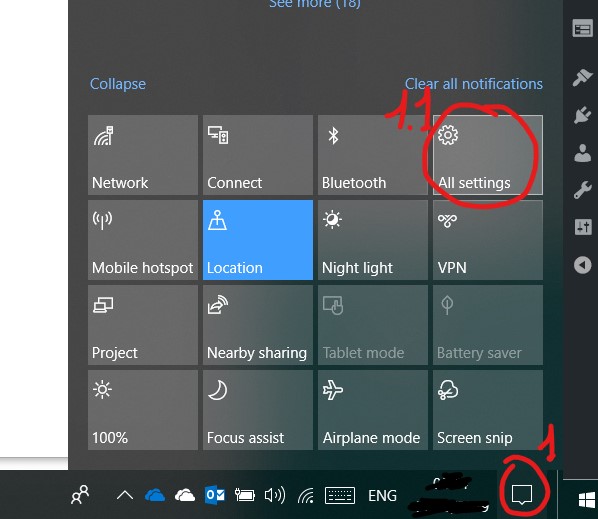 This can be done in two ways. The easiest can be to reach the System Properties windows from the Notification panel (1 step) available in the right of the bottom toolbar, choosing All Settings tile (1.1 step ), searching remote assistance (2 step) (IT: assistenza remota) and choosing Allow Remote Assistance invitations to be sent from this computer (step 3):