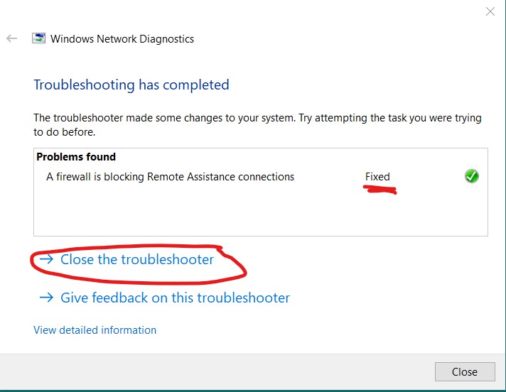 After fixing that problem, close the troubleshooter and launch again the Remote Assistance client: