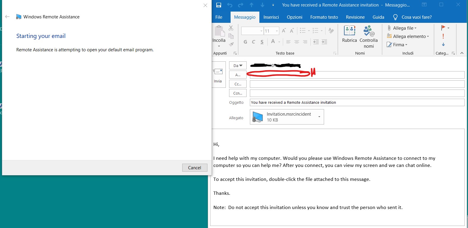 This time the Windows Remote Assistance client will run properly showing several ways to let you invite a trusted helper. In the following, I will show the most common one that is using an email invitation. Choosing that option, a compatible email client is launched attaching the proper invitation: you only need to specify the email of the trusted helper and send that already prepared email. Moreover, a password will be created and it must be provided (possibly by phone) to the remote user in order he will be able to connect to your PC.