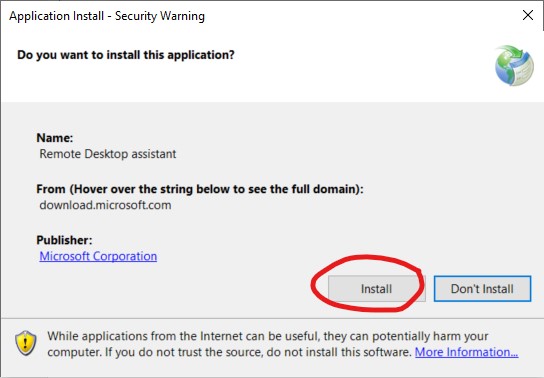 Clicking on Download button a rdassistant.application file is downloaded: launching it allows to have the Microsoft Remote Desktop assistant application installed: