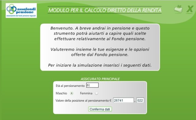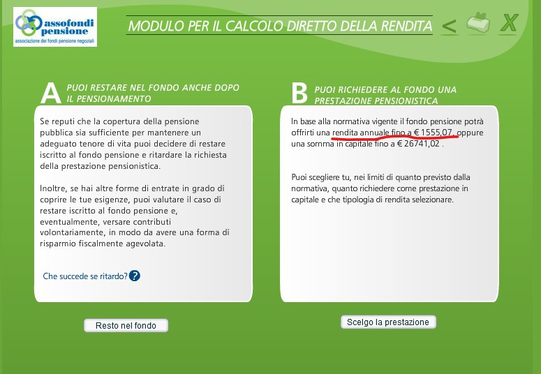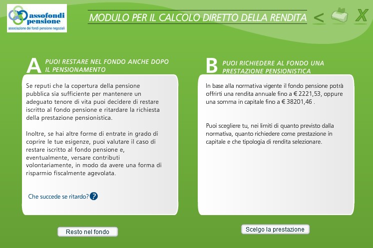 Nello specifico il motore di calcolo per la rendita offre all’iscritto la possibilità di confrontare, in termini economici, le diverse tipologie di rendita offerte da Telemaco al momento del pensionamento. Inserendo il  valore della posizione maturata si rileva la possibilità o meno di percepire l’intera erogazione in Capitale, in alternativa è previsto l’obbligo di percepire fino al 50% in Capitale ed il restante in forma di rendita.