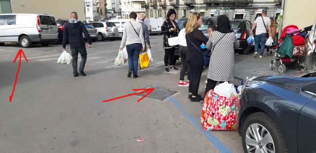 … spesso, nelle ore di punta, la situazione è addirittura ben peggiore, con macchine accatastate anche in terza fila. La presenza, qui come altrove, di dehor concessi dal Comune in prossimità di incroci e passaggi pedonali, limitano per di più la visibilità dei pedoni oltre che essere tipicamente sede di posteggi irregolari, in questo caso proprio dietro una curva.