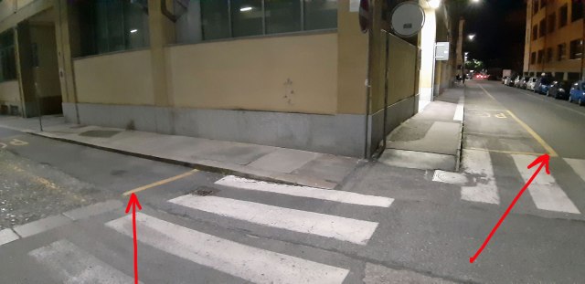 Ho dovuto perciò campionare per diversi giorni, prima di trovare libero quello spazio ora in divieto e riuscire quindi a fotografare bene le nuove indicazioni sul selciato che si sono sovrapposte alle preesistenti che consentivano invece il parcheggio per qualche metro in più:
