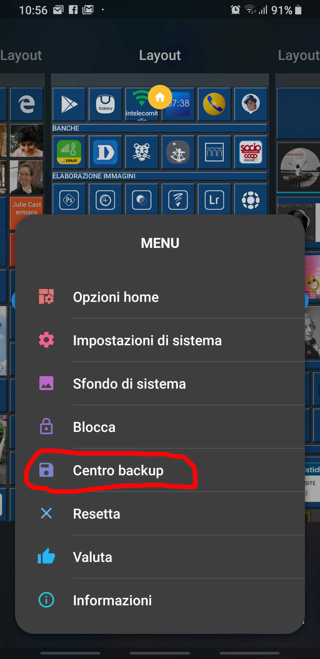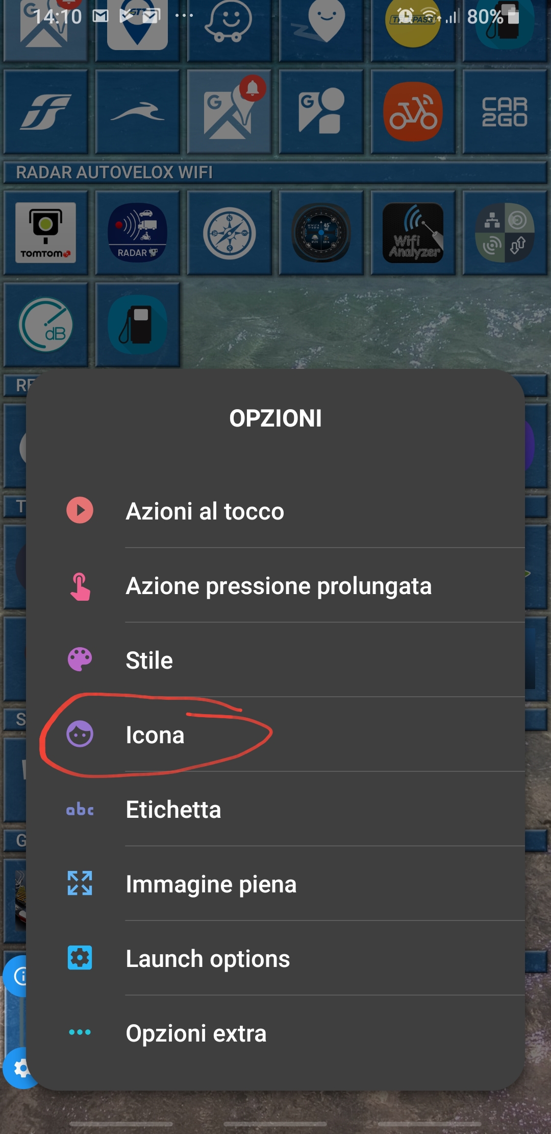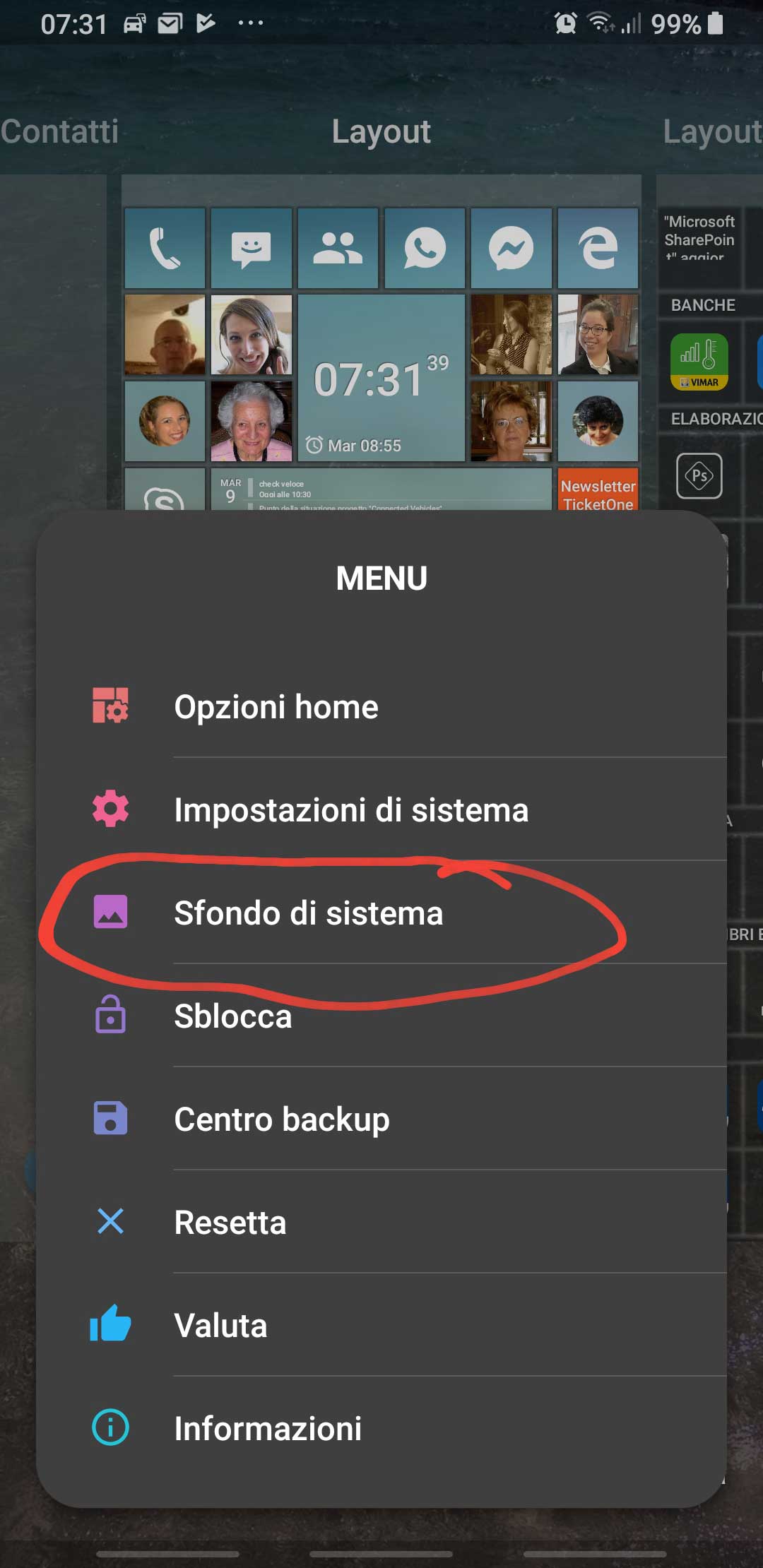 The Menu icon on the bottom left is always available and let you change all options available in the Home Square launcher [IT: Opzioni Home] even when the launcher is not in Modify operating mode: