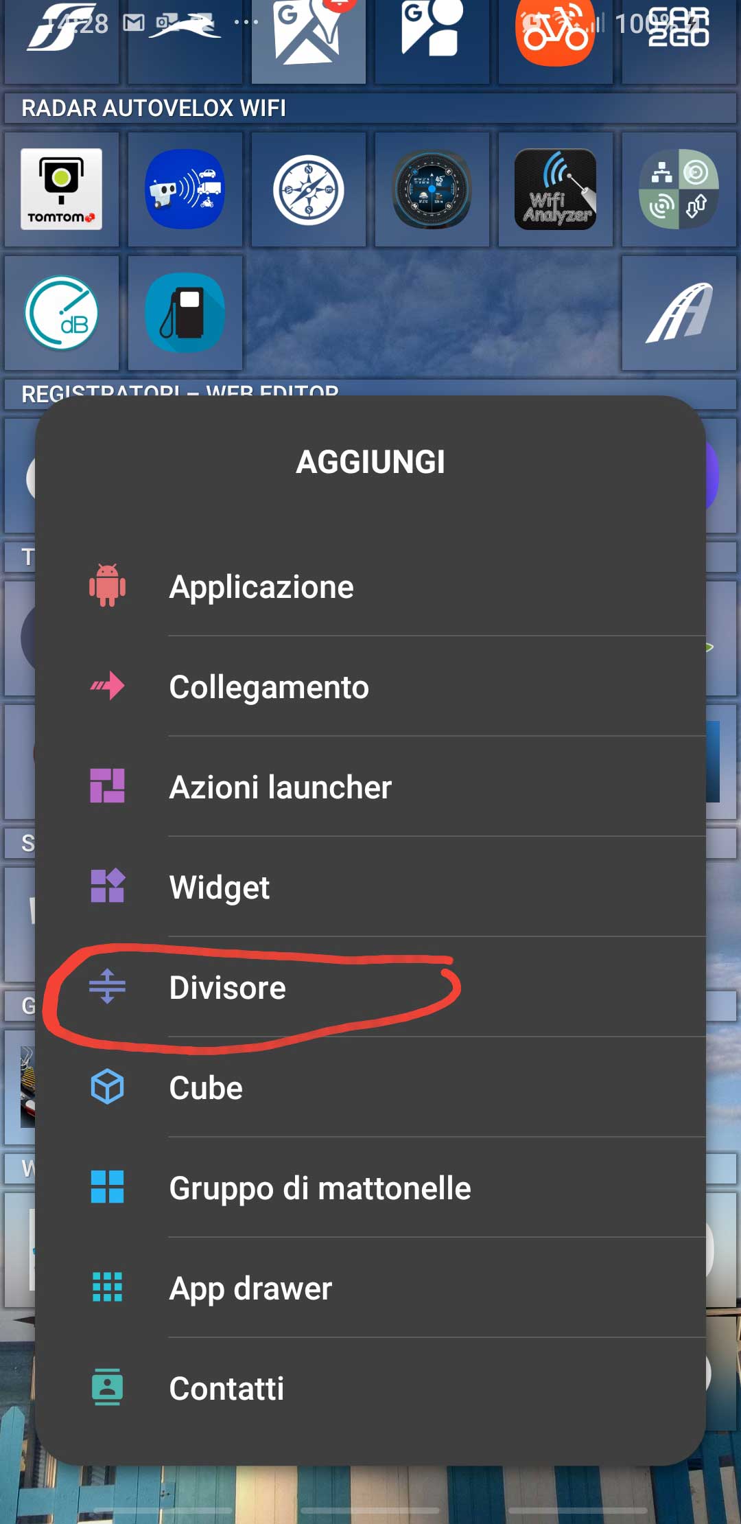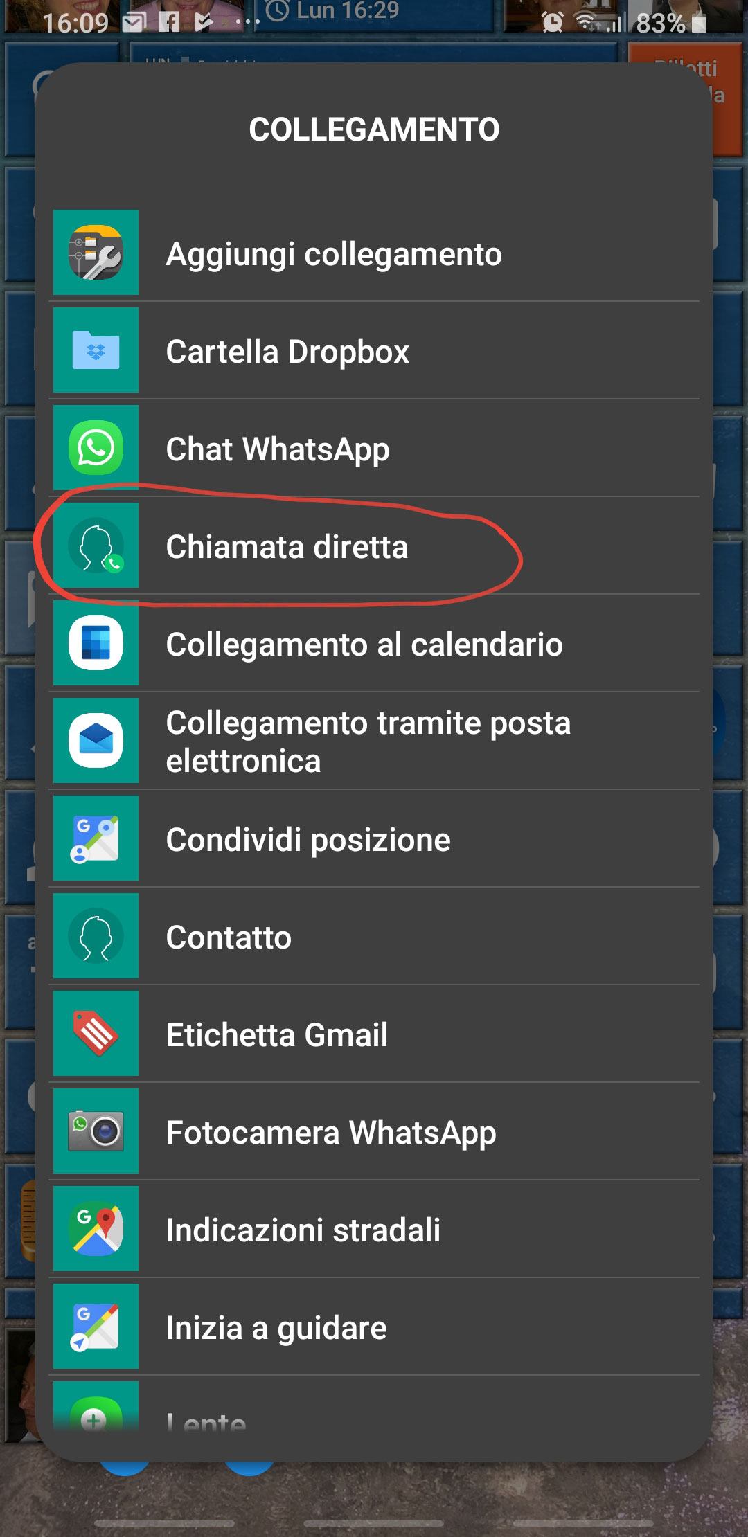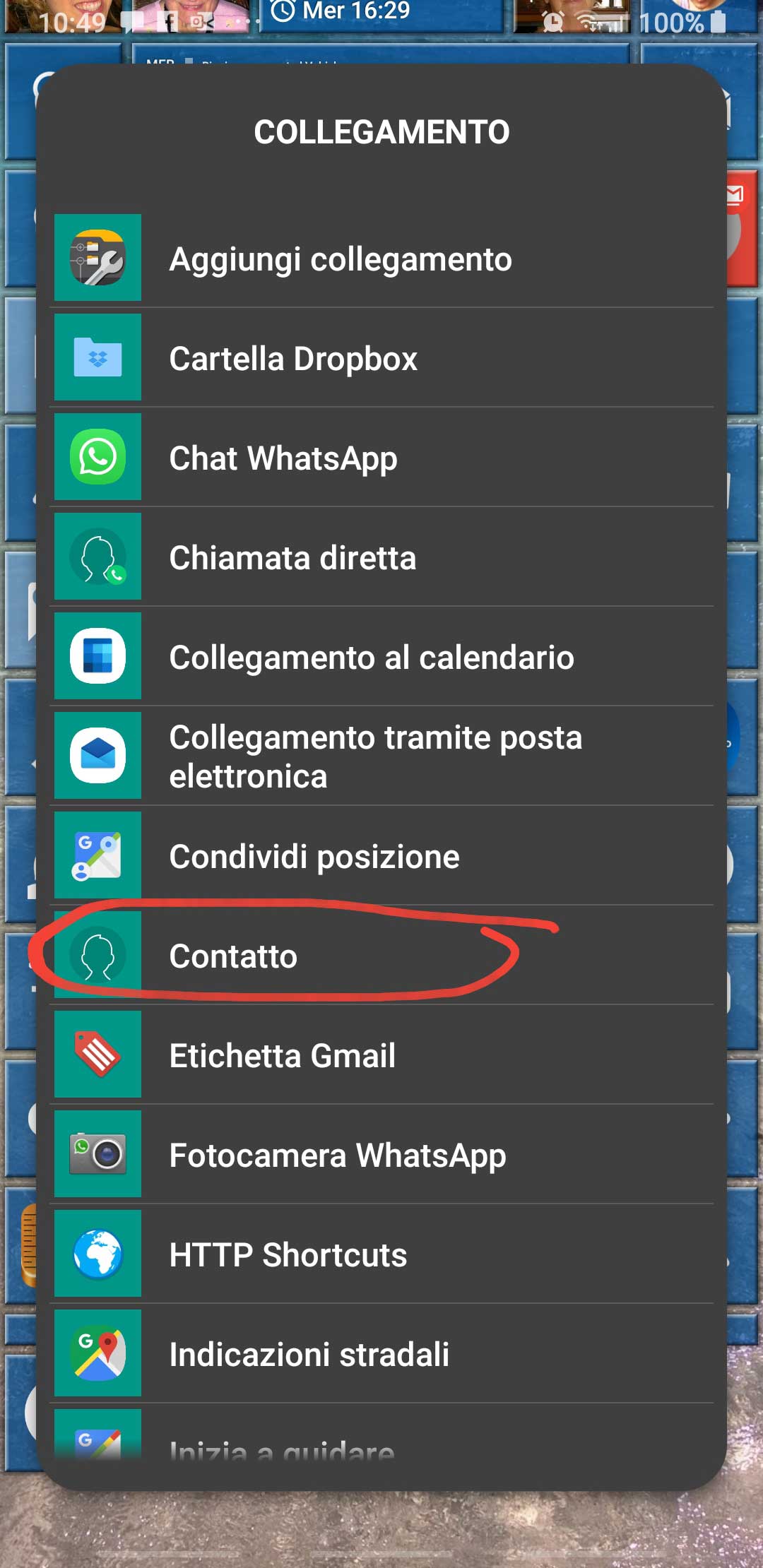 To set those behaviors, as a first step you must add a tile with the picture of the contact. So set the launcher in Modify mode, then click on the “[+]” icon available at the bottom, choose the second option “Link” [ITA: “Collegamento“] and finally Contact [IT: Contatto]. Selecting the wanted contact (possibly one with an associated photo), an associated tile is created and, whenever pressed, it will open that contact page.