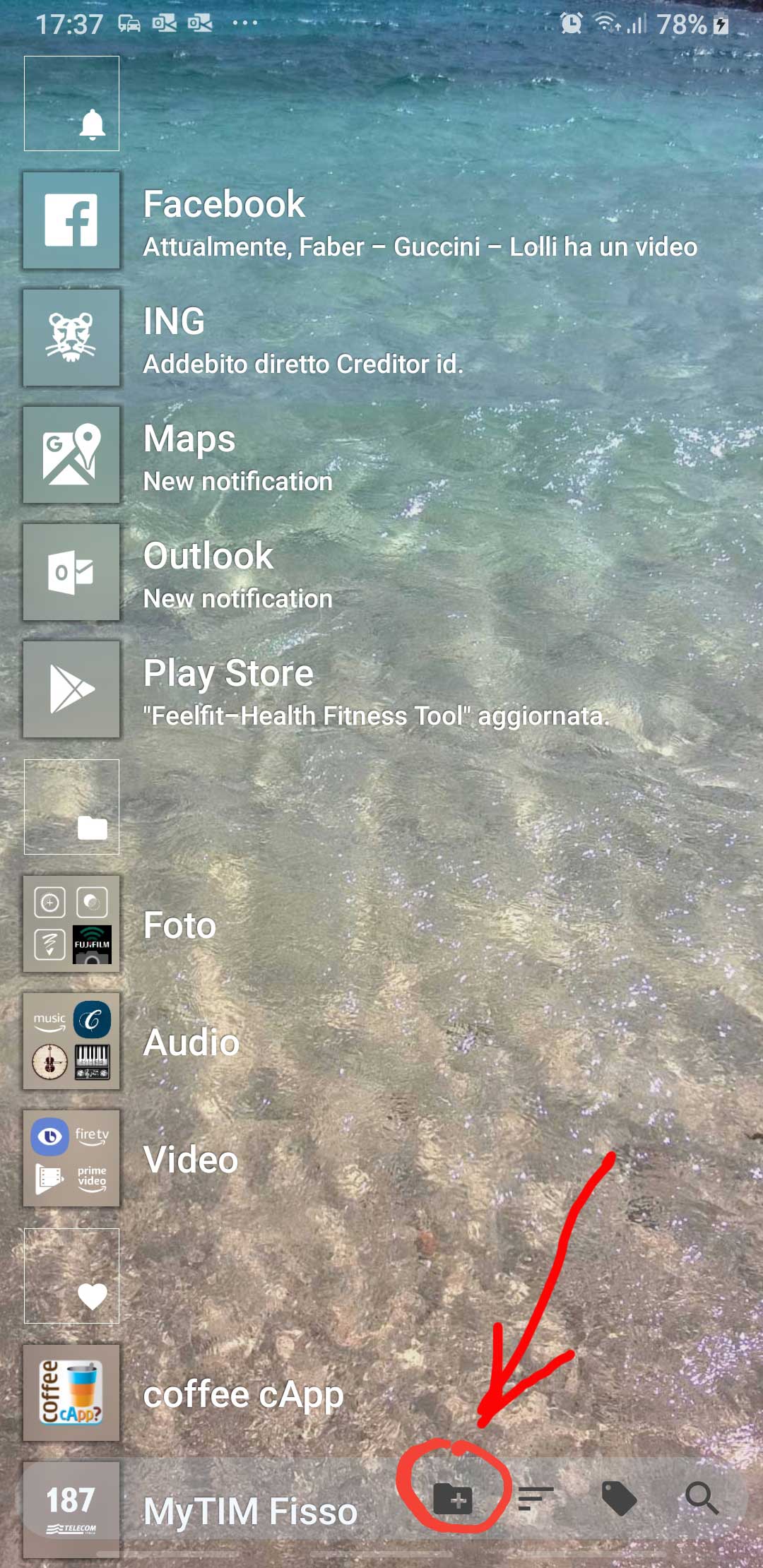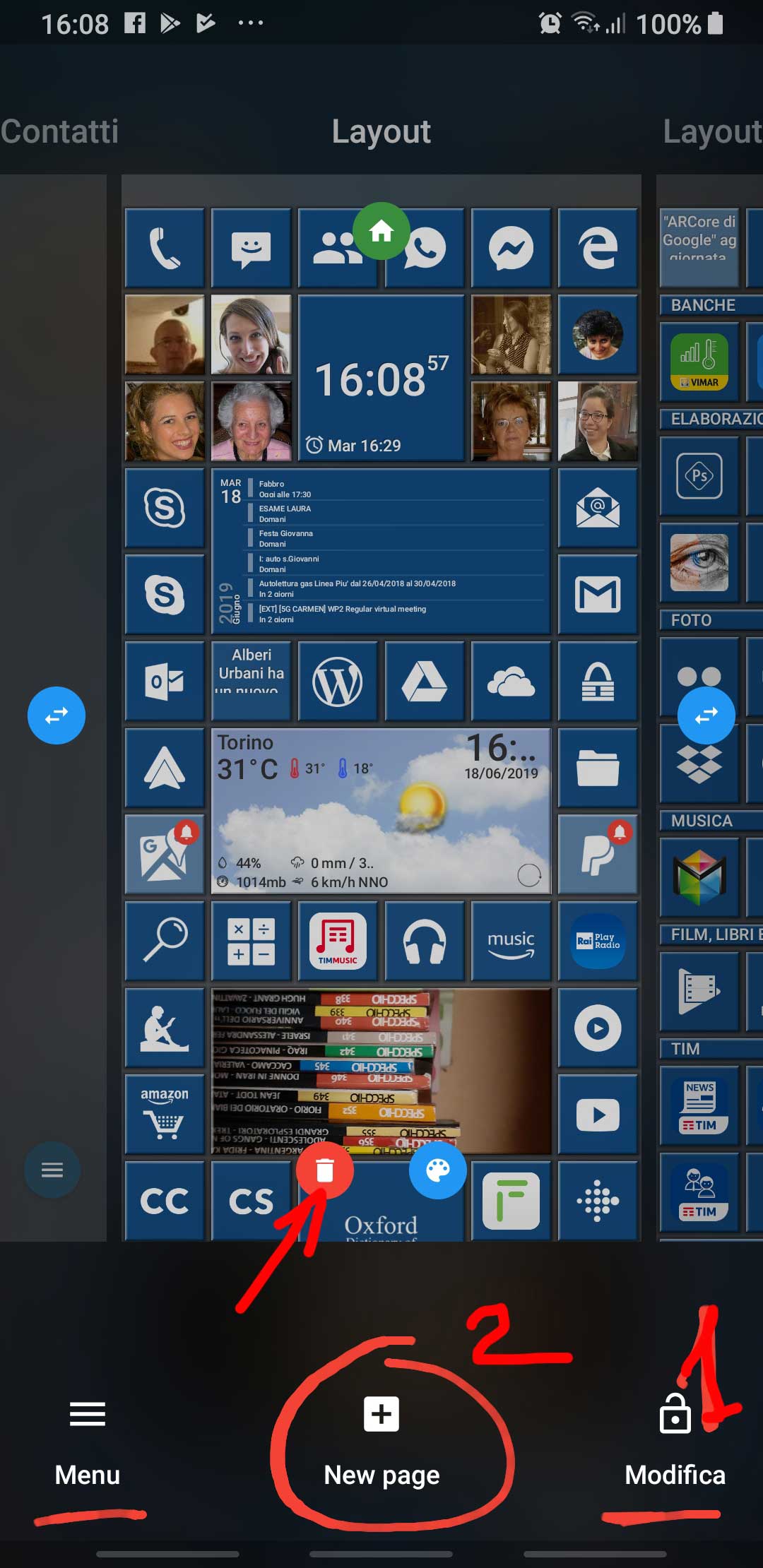 To add new tiles and/or new items in some menu, there is the need to set the Home Square launcher in Modify operating mode. This can be done, from whatever page of the launcher (even not the home one if you have set more pages, like Contacts, App drawer, ecc …), clicking the Modify [IT: Modifica] closed padlock icon, available on the bottom-right, that will change its appearance to become an open padlock. In this operating mode, a New Page icon appears in the bottom center and, after pinching out so returning to normal view, let you add new tiles and modify existing ones.