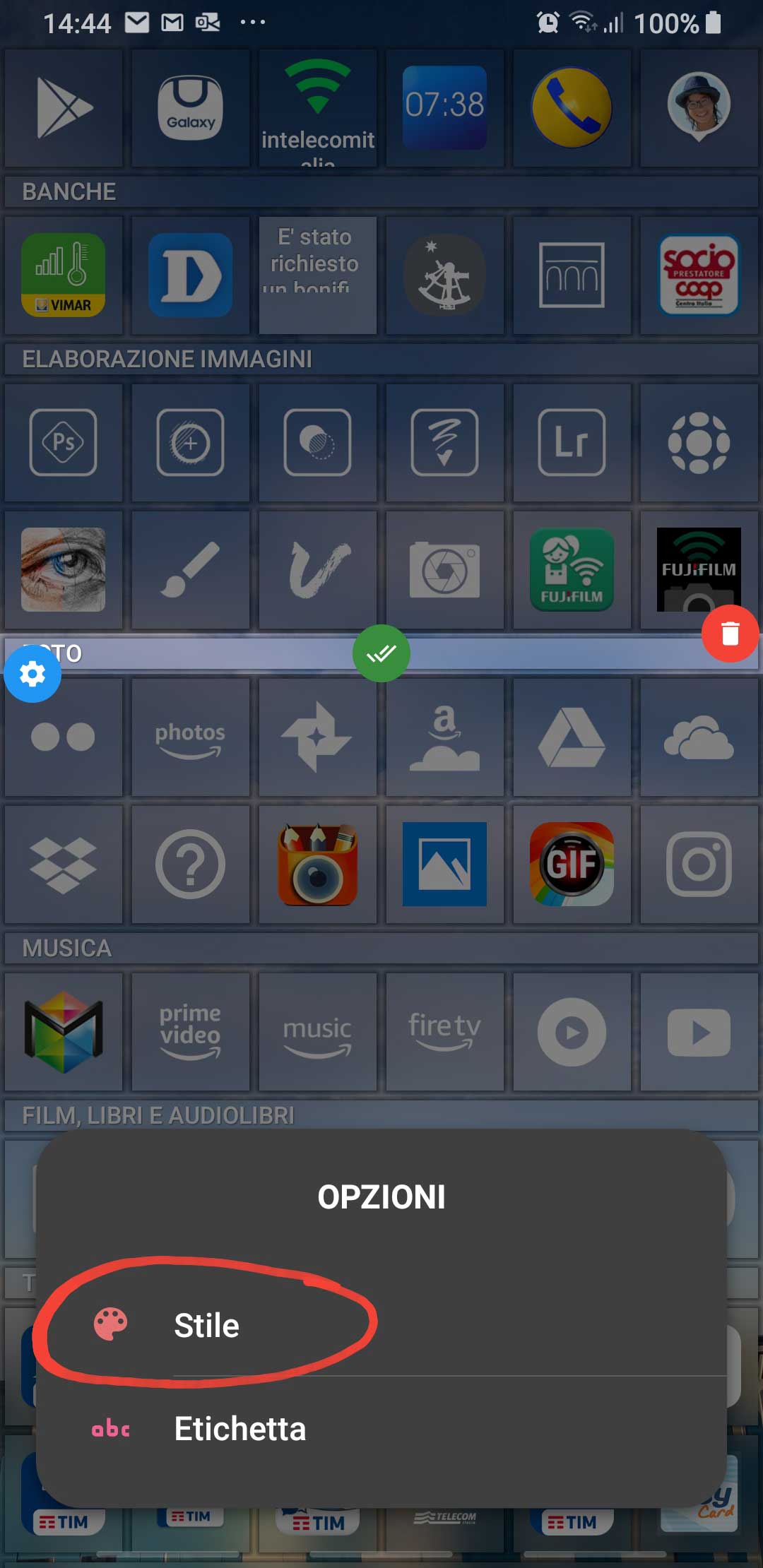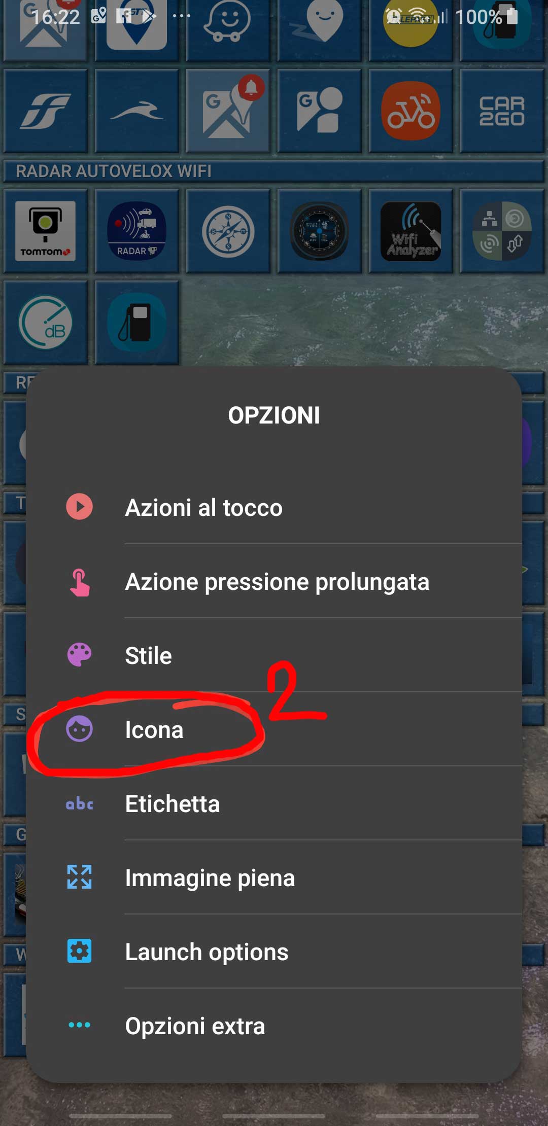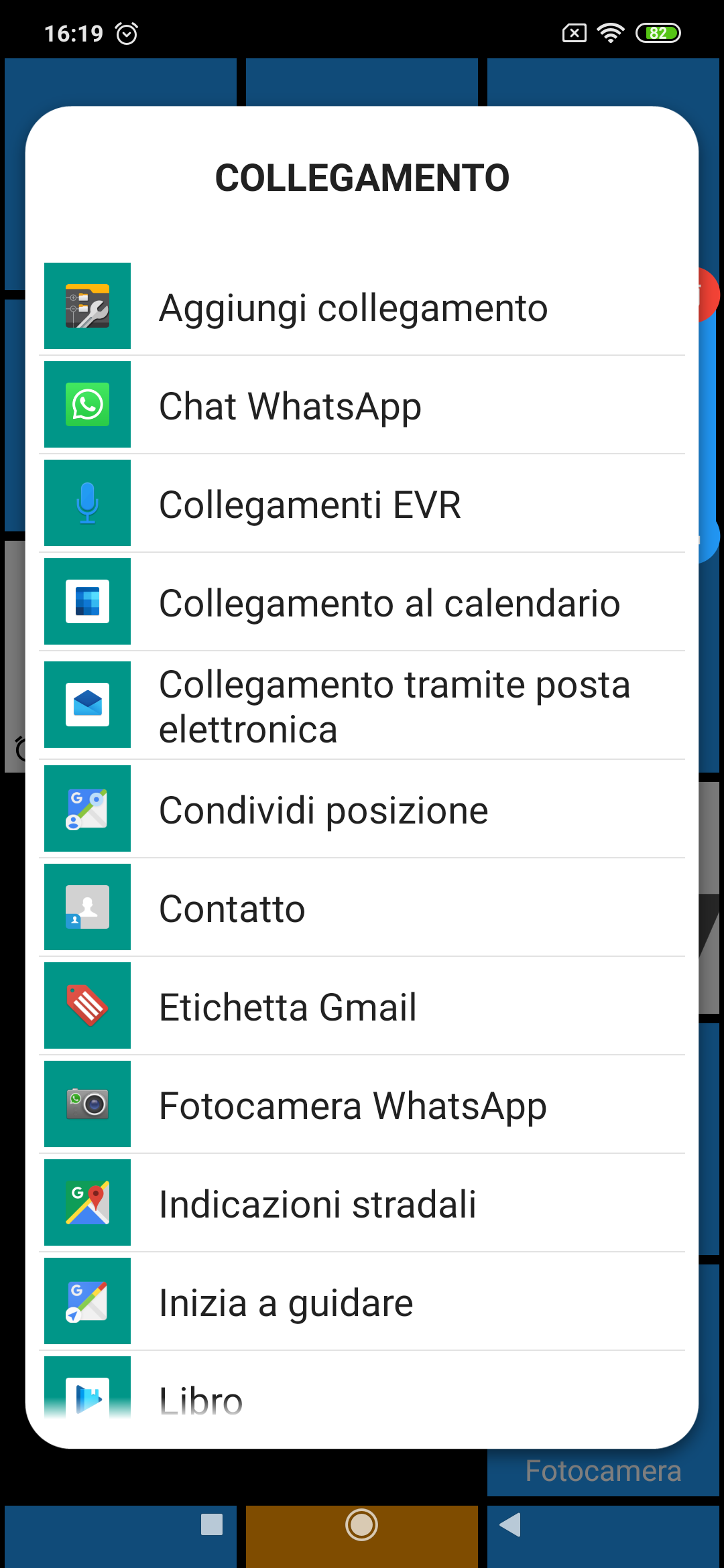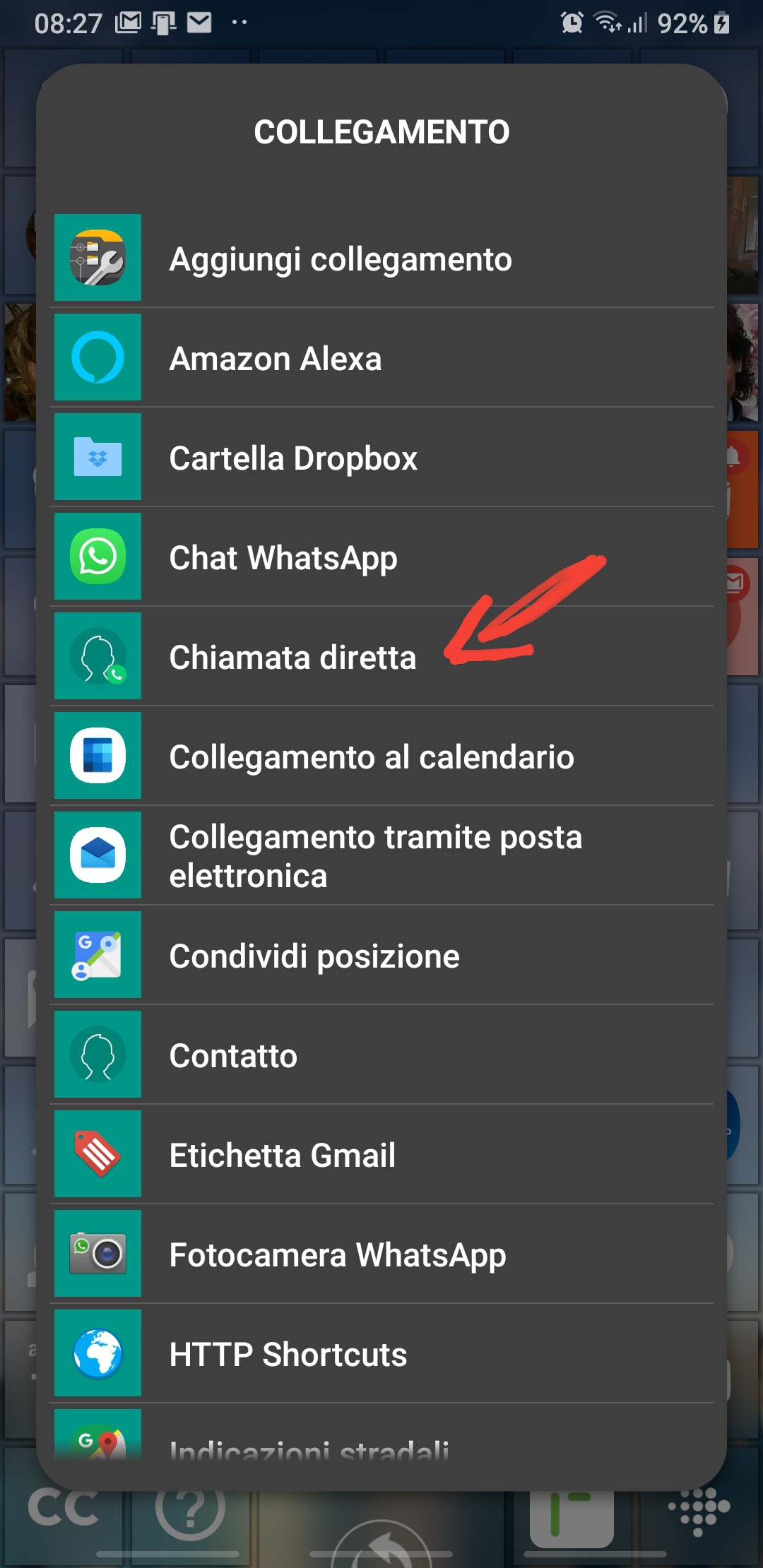 As a possible further step, you can add another behavior to that tile, that is to start a direct call to a predefined number of him/her, just long-pressing that tile. This is the same behavior you have in the built in contacts list page, where a direct call can be started just long-pressing one of the listed names. To set that long-pressing feature on a tile, you have (always when the launcher is in Modify mode) to long-press the tile in order to get some tile setting appears on its summits: choose the bottom-left one with the options icon, then select the second item in the list, i.e. “Action on long-pressing” (IT: “Azione pressione prolungata“), then the third in the popup options, i.e. “Link” [IT: “Collegamento“), then the forth in the list, i.e. “Direct call” [IT: “Chiamata diretta“], then choose again the same contact and finally one of his/her phone numbers.