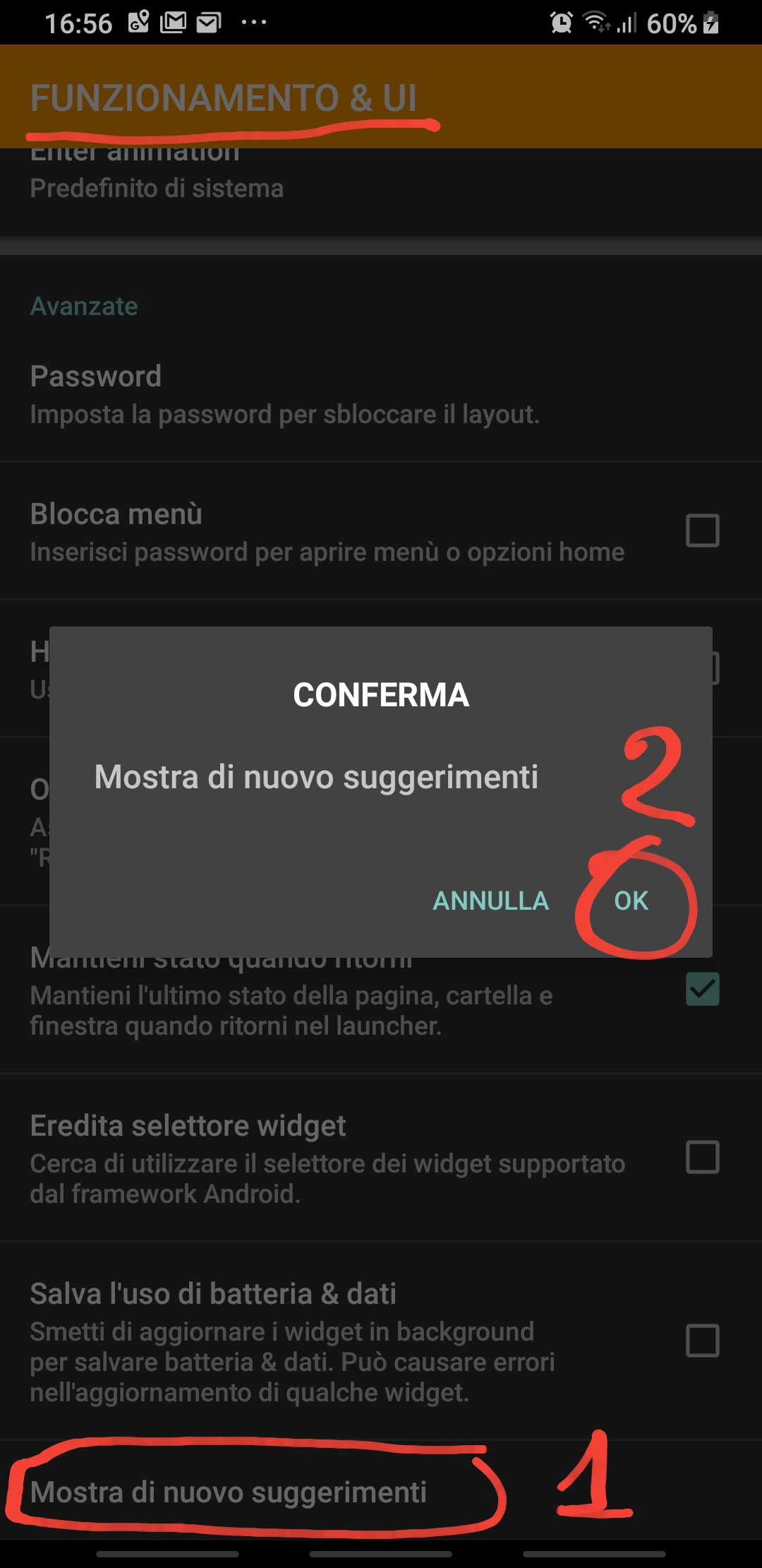 Moreover, you can select the option Show suggestions again [IT: Mostra di nuovo suggerimenti] in the Functions & UI [IT: Funzionamento & UI] section of Home options [IT: Opzioni Home]. If set, the launcher will display some suggestions when you are configuring it: try it … you can always switch it on/off whenever you want!