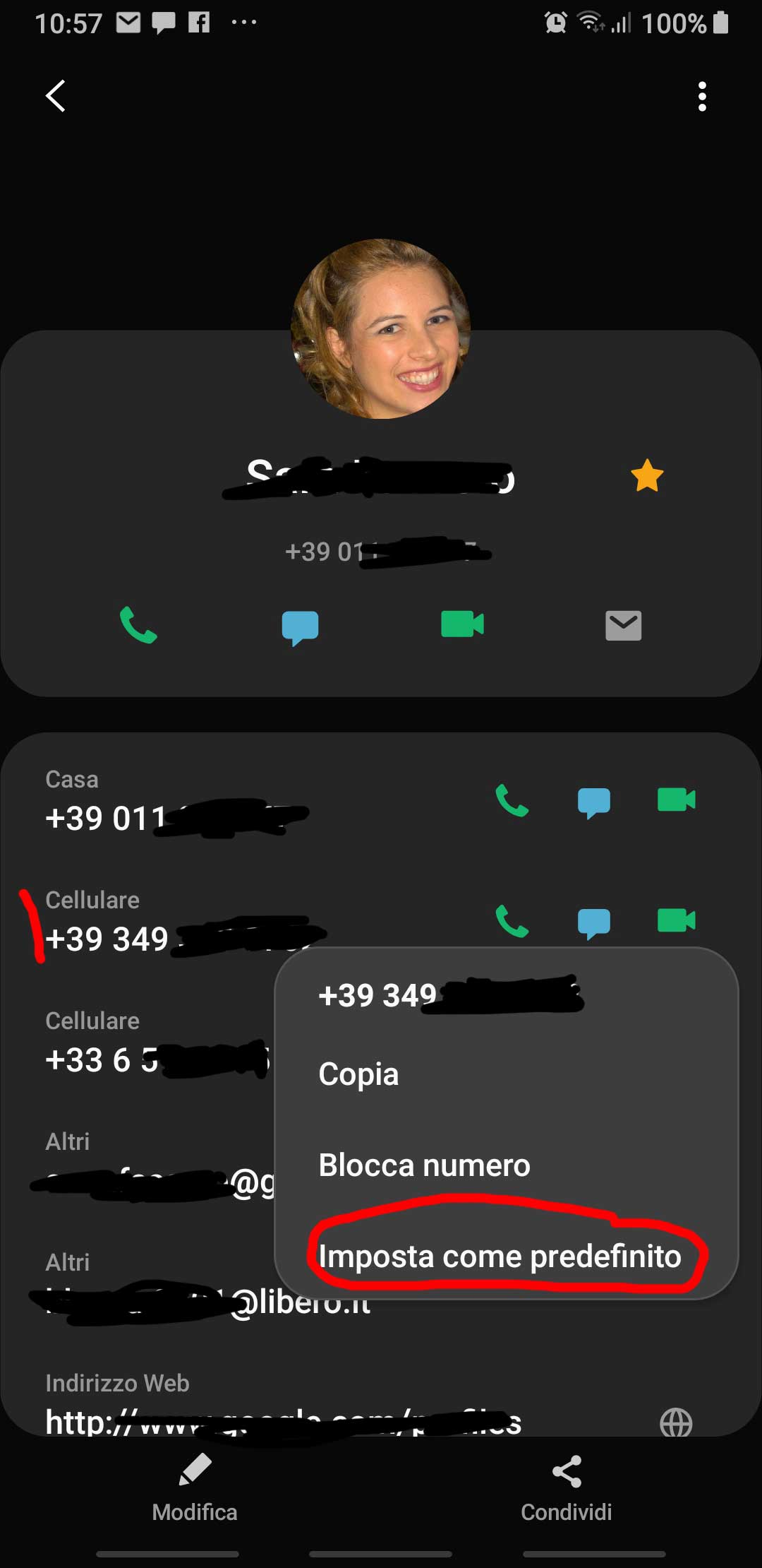 To set a specific number as the default one, just open a contact page (e.g. choosing it from the contacts list or clicking on a newly created associated tile) then long-press the wanted phone number and, from the popup menu, set it as the default one , i.e. “Set as default” [IT: “Imposta come predefinito“].
