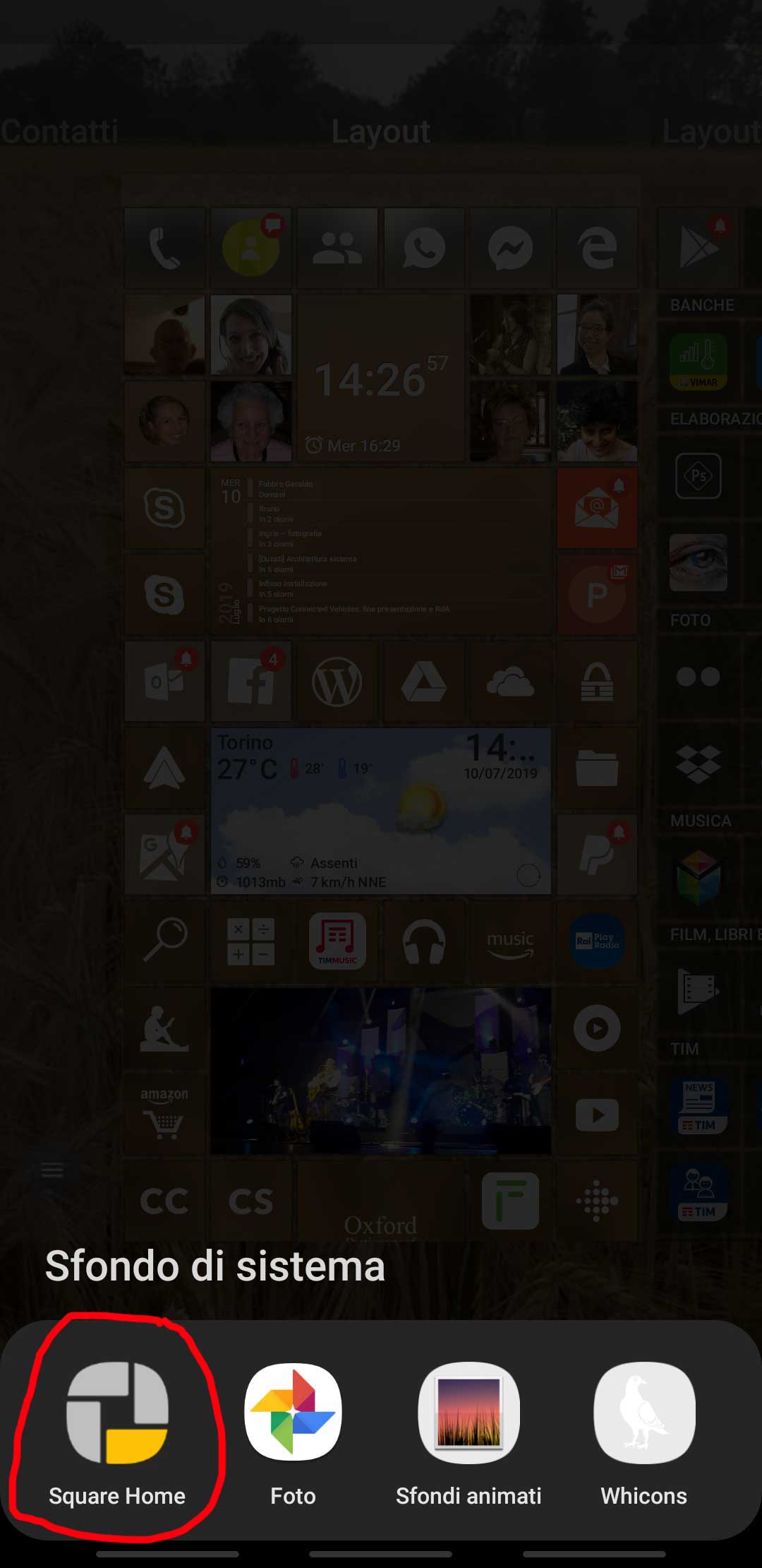 To configure Square Home app and display its menu items, from whatever page of the launcher (even not the home one if you have set more pages, like Contacts, Apps, ecc …), you have to simply place two fingers on the touchscreen and pinch in.