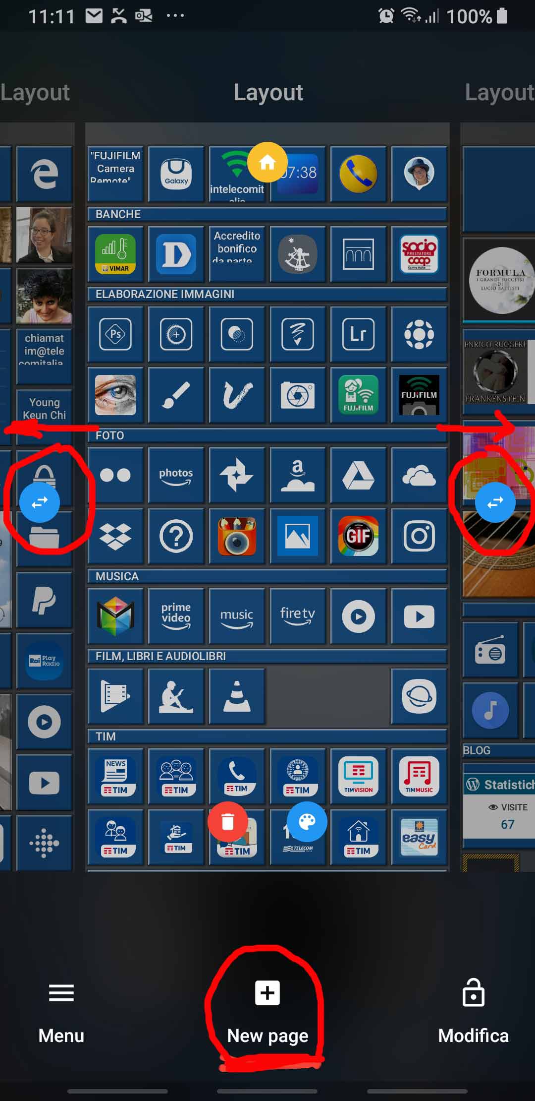 To add new pages, that will show like pivot ones, you have to select the + New page icon, available in the bottom center only when the launcher is in Modify operating mode. Then, each created page can possibly be deleted using the red trash icon associated with it.