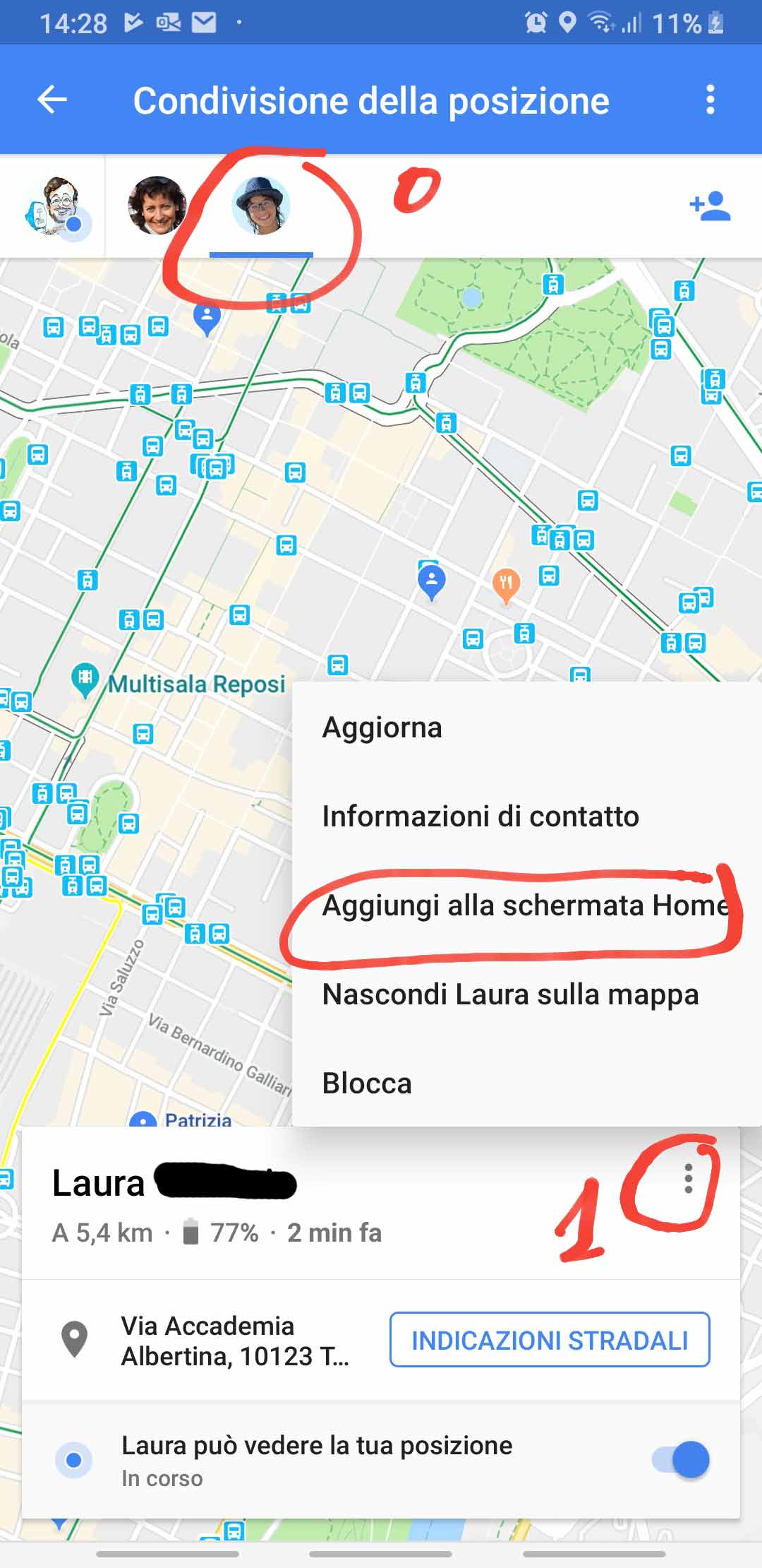 At the bottom, I created a homepage shortcut to the family members current position using the specific Google Maps feature: there is in fact an Add to Home (IT: Aggiungi alla schermata Home) option in the Share position section of Google Maps. Obviously an agreement should be provided in sharing with others each own position and that procedure is already handled by Google Maps.