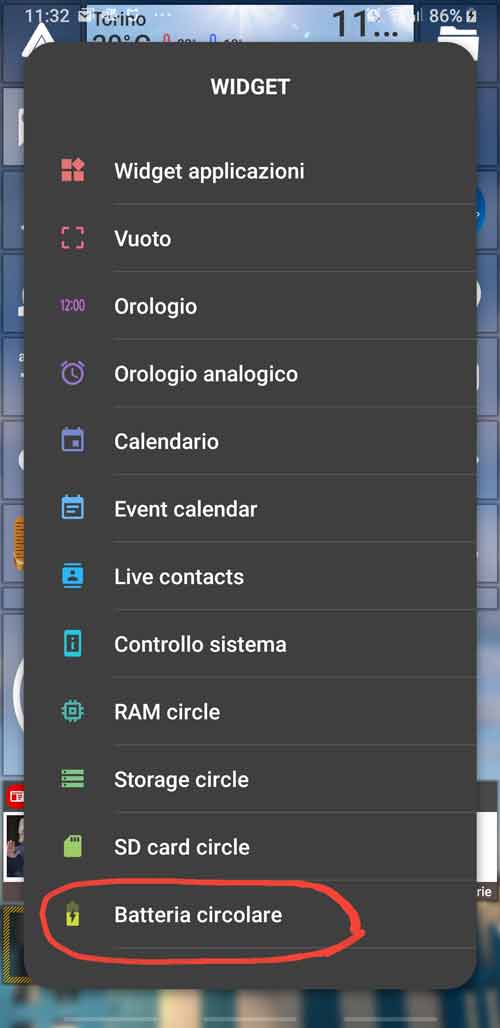 However at the end I choose the top left one, that is the widget available in Square Home itself. That widget provided by Square Home is simple and does not have a color to specify if the level is good, medium or critical … but it does its work without the need to install another app that, especially if free, ask me to agree to several permissions and possibly gives some ads. Note that this feature is one of those that are maintained only if you buy the Square Home Key. To add a tile associated to the Square Home embedded battery widget, you have to select the Battery cicle (IT: Carica della batteria) among the Widget page: