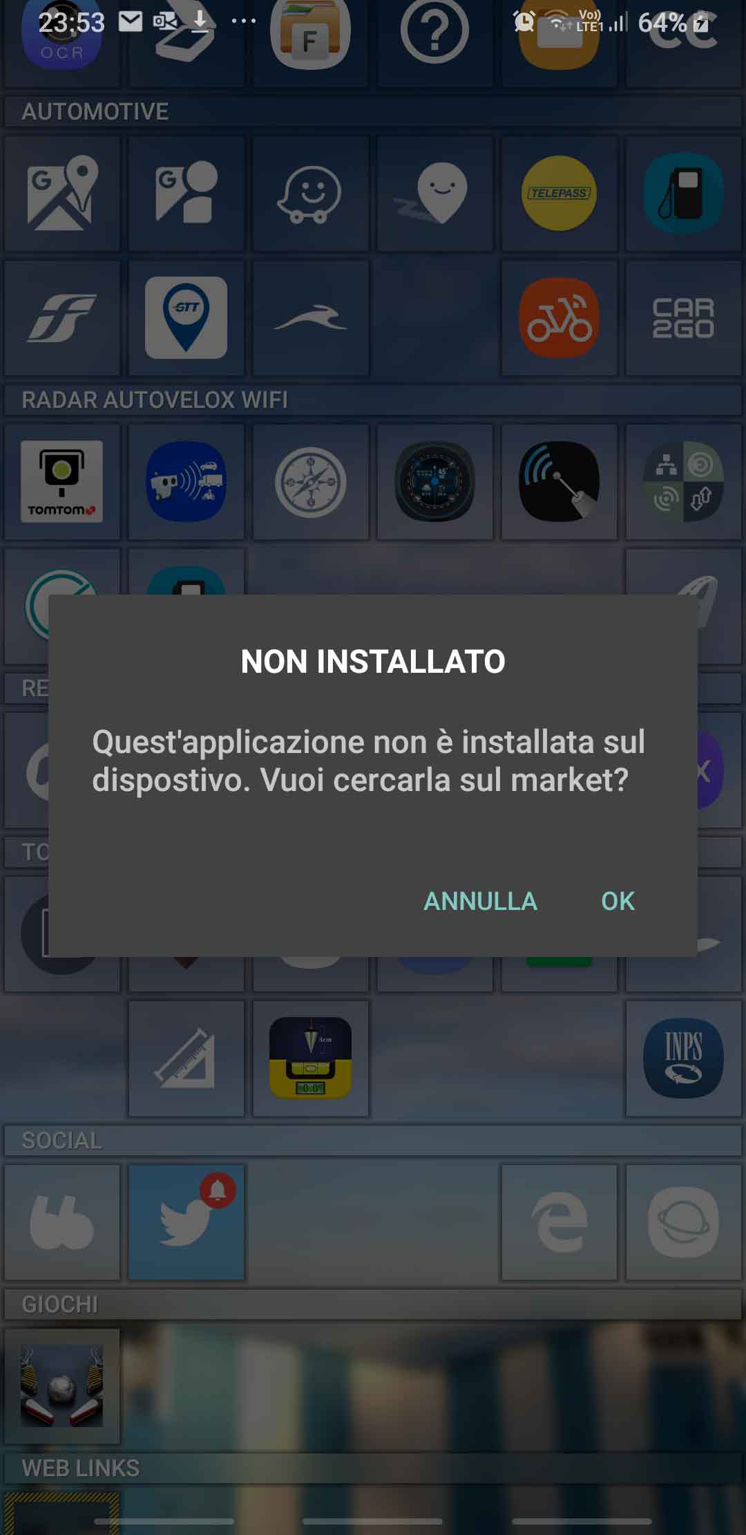 Fewer times that question mark tile was even no more linked to the app so, clicking on it, let a popup windows opens saying that the app is not installed and asking me if I want to search it in the market: