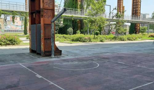Non era certo un campo da basket regolamentare e già avevo avuto modo di ridire in uno dei miei precedenti post (Canestro nel campetto di basket del parco Dora a Torino finalmente ripristinato … ma in che modo???!!!!): i canestri non erano stati collocati neppure simmetricamente, dal momento che uno dei due era stato rimesso (in una posizione un po’ più regolamentare) dopo che il precedente mancava da anni … senza tuttavia effettuare un’analoga operazione anche su quello del lato opposto … 😦