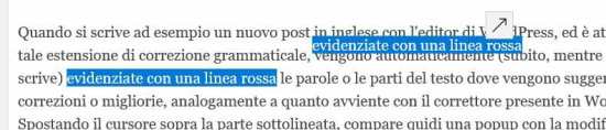 Si noti infine che il browser Edge presenta il seguente fastidioso comportamento quando viene utilizzato l’editor di WordPress: se si fa un cut&past di una parte di testo per spostarlo, al contenuto reinserito viene applicato talvolta un tag HTML di <span> (e.g. <span style=”display: inline !important; float: none; background-color: #ffffff; color: #444444; cursor: text; font-family: Georgia,’Bitstream Charter’,serif; font-size: 12px; font-style: normal; font-variant: normal; font-weight: 400; letter-spacing: normal; orphans: 2; text-align: left; text-decoration: none; text-indent: 0px; text-transform: none; -webkit-text-stroke-width: 0px; white-space: normal; word-spacing: 0px;”> evidenziate con una linea rossa </span>) che altera lo stile del testo: per riportarlo alle condizioni iniziali si richiede quindi un editing nel codice HTML.