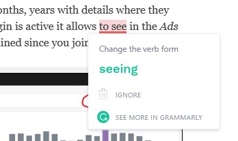 Quando è attivo Grammarly for Microsoft Edge e si scrive, ad esempio, un nuovo post in inglese con l’editor di WordPress, vengono anche in questo caso automaticamente evidenziate (mentre si scrive), con una linea rossa, alcune parti del testo che necessitano migliorie. Spostando il cursore sopra la parte sottolineata, compare poi una popup con la modifica suggerita e, cliccandoci sopra, anche in questo caso quella viene direttamente applicata al testo. Si noti però che non vengono evidenziati i solo errori di battitura, bensì anche quelli grammaticali e magari sono proposte anche possibili migliorie. Infine, risulta presente un tasto See more in Grammarly per ricevere ulteriori delucidazioni sul suggerimento proposto: seguendo tale link si imparano, tra l’altro, molti aspetti della lingua Inglese che magari non si conoscono!