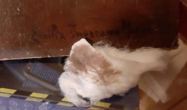 Vista la consistenza già sufficientemente spalmabile, non ho poi reputato opportuno effettuare alcuna diluizione. Utilizzando piccoli batufoli di cotone imbevuti di un po’ di quella crema, ho proceduto a pulire a piccoli passi ogni parte di ciascun dipinto. Notando che, sebbene in minima parte, anche del colore veniva rimosso al passaggio della soluzione, colorando leggermente il batufolo inizialmente bianco, ho proceduto alla pulizia in modo da passare su zone di colore simili prima di cambiare cotone, in modo tale da non rischiare di mischiare eventualmente dei colori. Sono partito sempre dalle parti chiare, in quanto sono poi quelle dove l’operazione di pulitura si noterà maggiormente. Infine, ho prestato particolare attenzione nel ripulire la zona dove c’era la firma del pittore, talvolta inizialmente addirittura nascosta dallo sporco da renderla quasi illeggibile. Ovviamente quel materiare deve essere spalmato sul cotone in dosi minime e deve essere esportato al più presto, prima che asciughi, utilizzando magari un nuovo batufolo pulito nell’ultima passata.