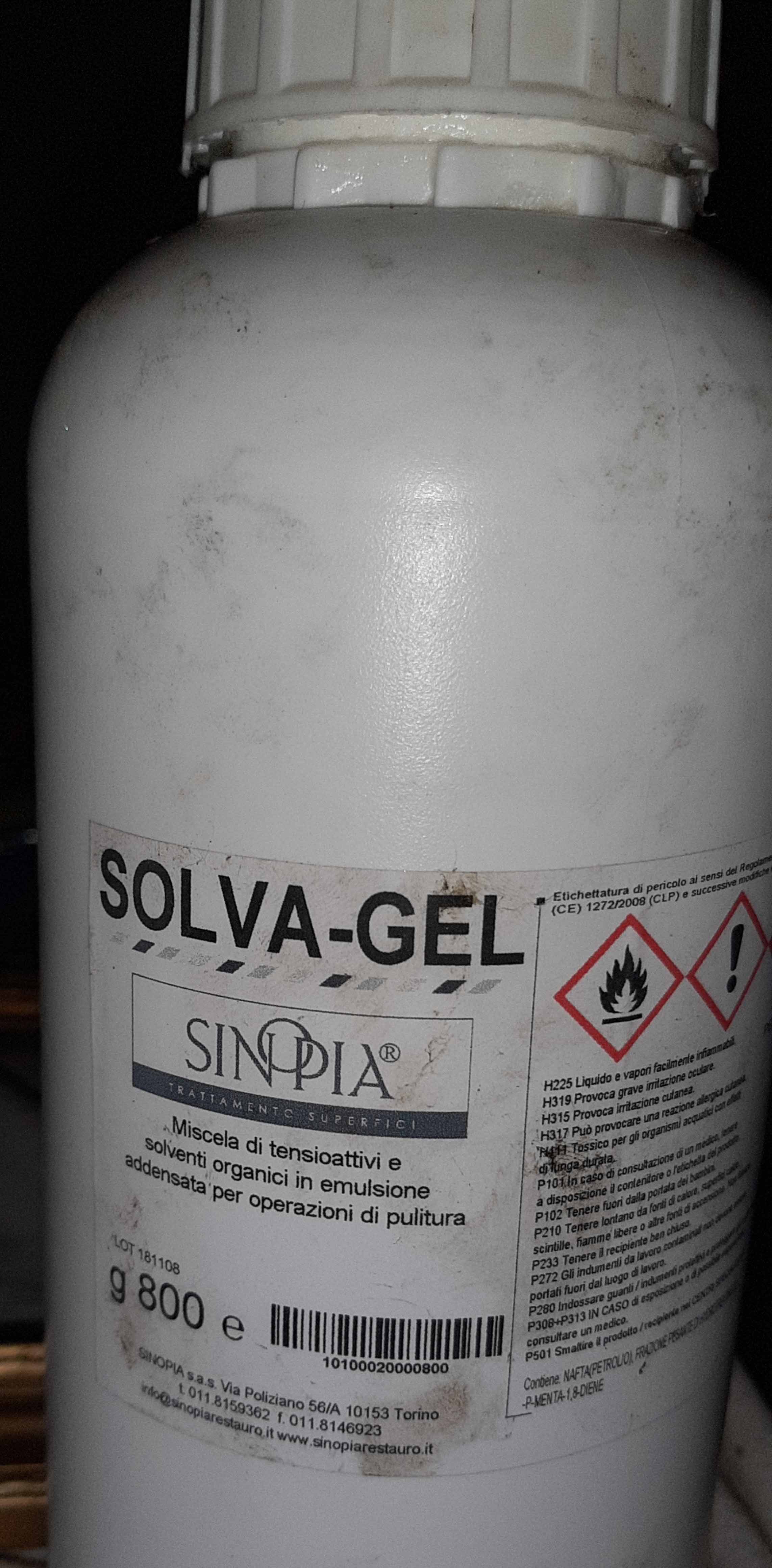 Descritto il mio intento al primo commesso disponibile, costui mi aveva consigliato di aspettare per parlare direttamente con il loro esperto in restauro di dipinti. Così ho fatto e, dopo aver ripetuto a quest’ultimo il mio obiettivo, le sue prime parole erano state poco confortanti: “Lo sa vero che ci sono persone che studiano diversi anni per poter effettuare il restauro più appropriato per un dipinto?“. Dopo avere ingoiato il rospo e chiarito ulteriormente i miei intenti non professionali, mi aveva quindi consigliato il loro prodotto Solva-gel, una crema “general purpose“, da utilizzare comunque con discrezione ed attenzione. Vista (in proporzione) la minima differenza di costo tra la confezione piccola e quella grande, e non avendo idea di quanto ne avrei consumato per ripulire ciascun quadro (e neppure sapendo con precisione il loro numero), avevo preso la confezione grande da 800g: con il senno di poi, avendo constatato che minimo è il quantitativo da usare, probabilmente anche al confezione piccola sarebbe stata più che sufficiente per ripulire la mia ventina di dipinti … comunque mi aveva confortato il fatto che quel preparato “non si deteriorava con il tempo” per cui lo avrei potuto utilizzare anche dopo diverso tempo!! Sull’etichetta di quel prodotto viene indicato: “Miscela di tensioattivi e solventi organici in emulsione addensata per operazioni di pulitura“… il che non dice molto, almeno alle mie orecchie da profano! Si presenta comunque come una crema bianca, agevolmente spalmabile utilizzando una tela o un batuffolo di cotone, essendo di una consistenza molto simile ai polish da me spesso utilizzati per pulire i mobili e rinnovarne la lucentezza.