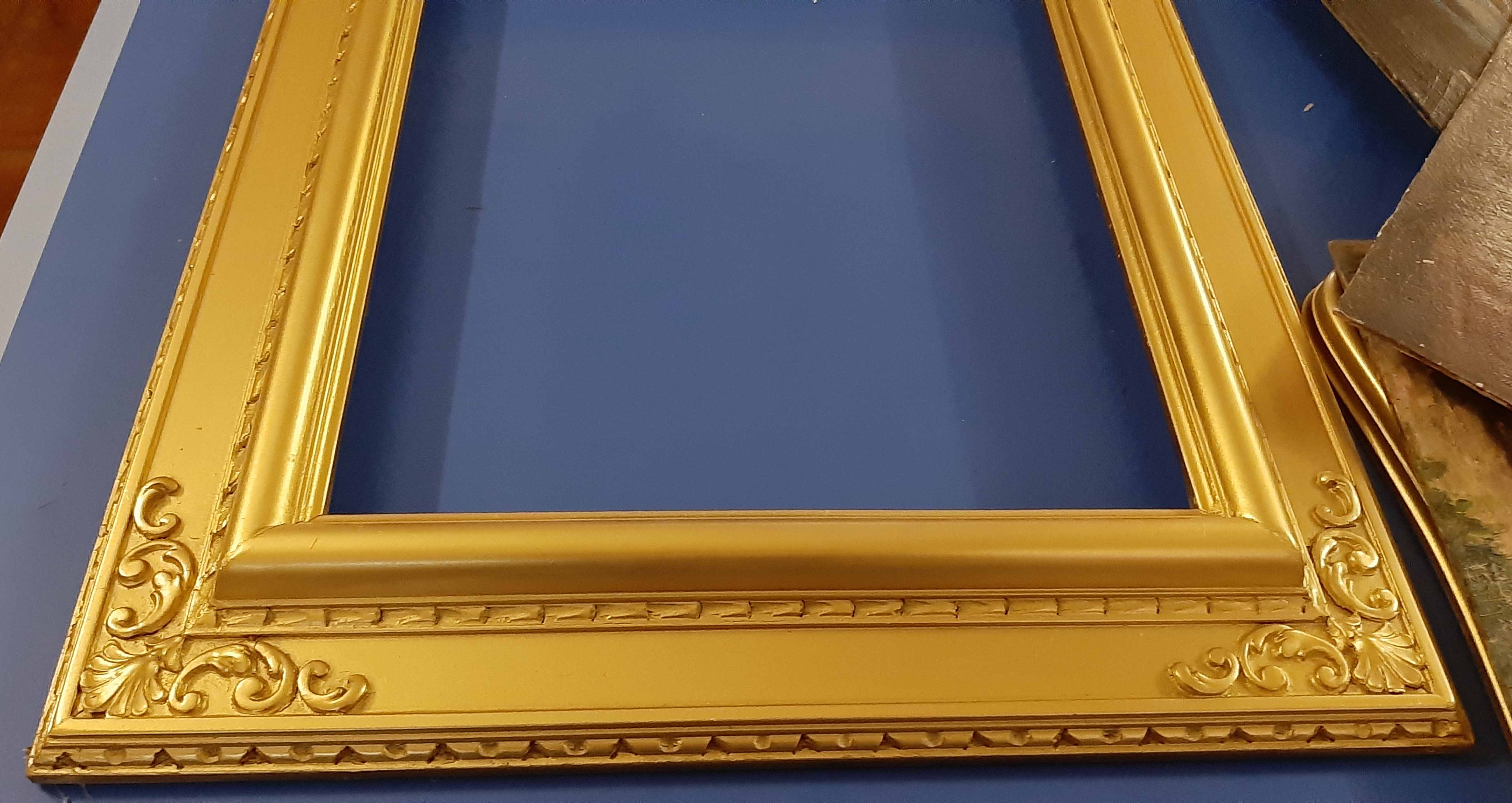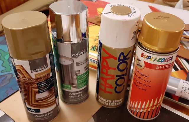 Quindi, si può utilizzare sia del colore acrilico (e.g. per pitturare eventuale passe-partout in legno) sia, più convenientemente, delle vernici spry, magari dorate: si noti che esistono diverse tonalità d’oro, più o meno marcate a seconda della marca.