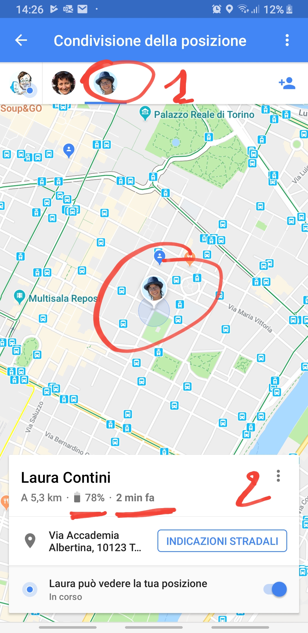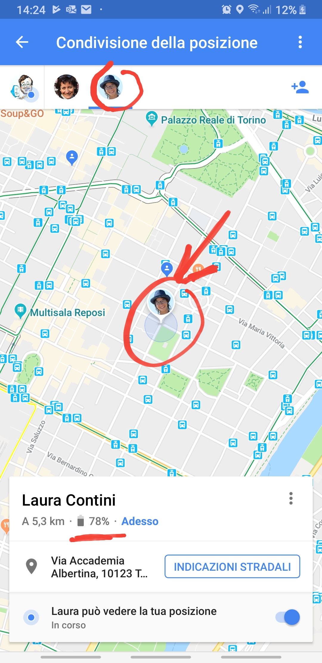 After those settings, every time you go into that Share your position [IT: Condividi la tua posizione] section of Google Maps app, you can see an icon on the map localizing each one who is sharing his position with you. Clicking on the pushpin with his image (if that contact has a picture associated with it) you can see more details, like how much real-time is the provided localization and even see the battery level of his smartphone. Very often the localization is in real-time so it is stated Now [IT: Adesso].