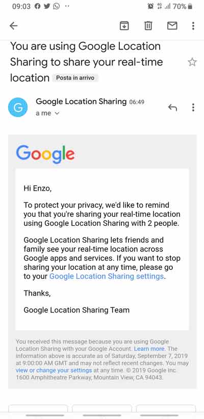 Privacy alert email from Google, you receive from time to time if you are sharing yor position with someone