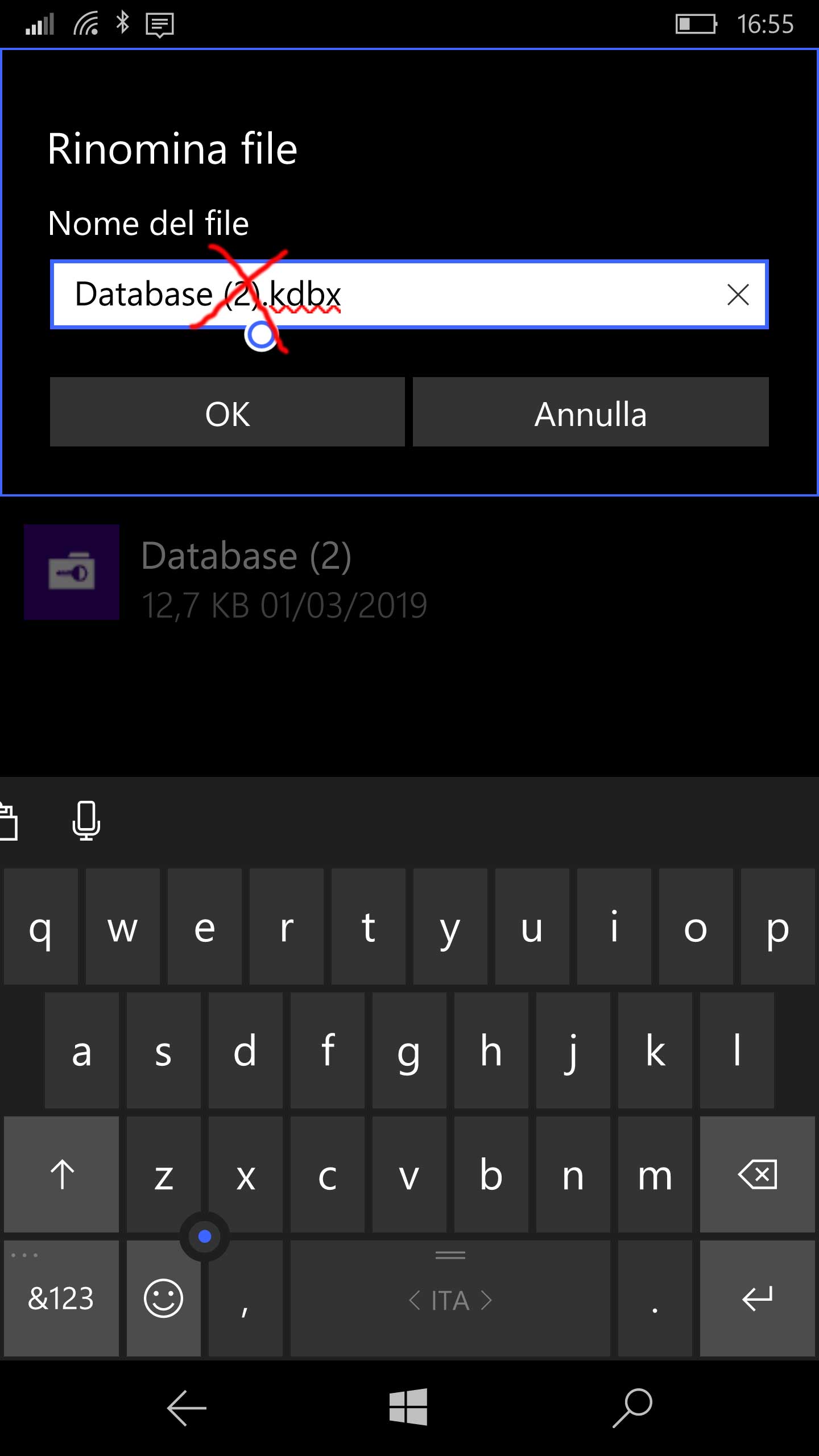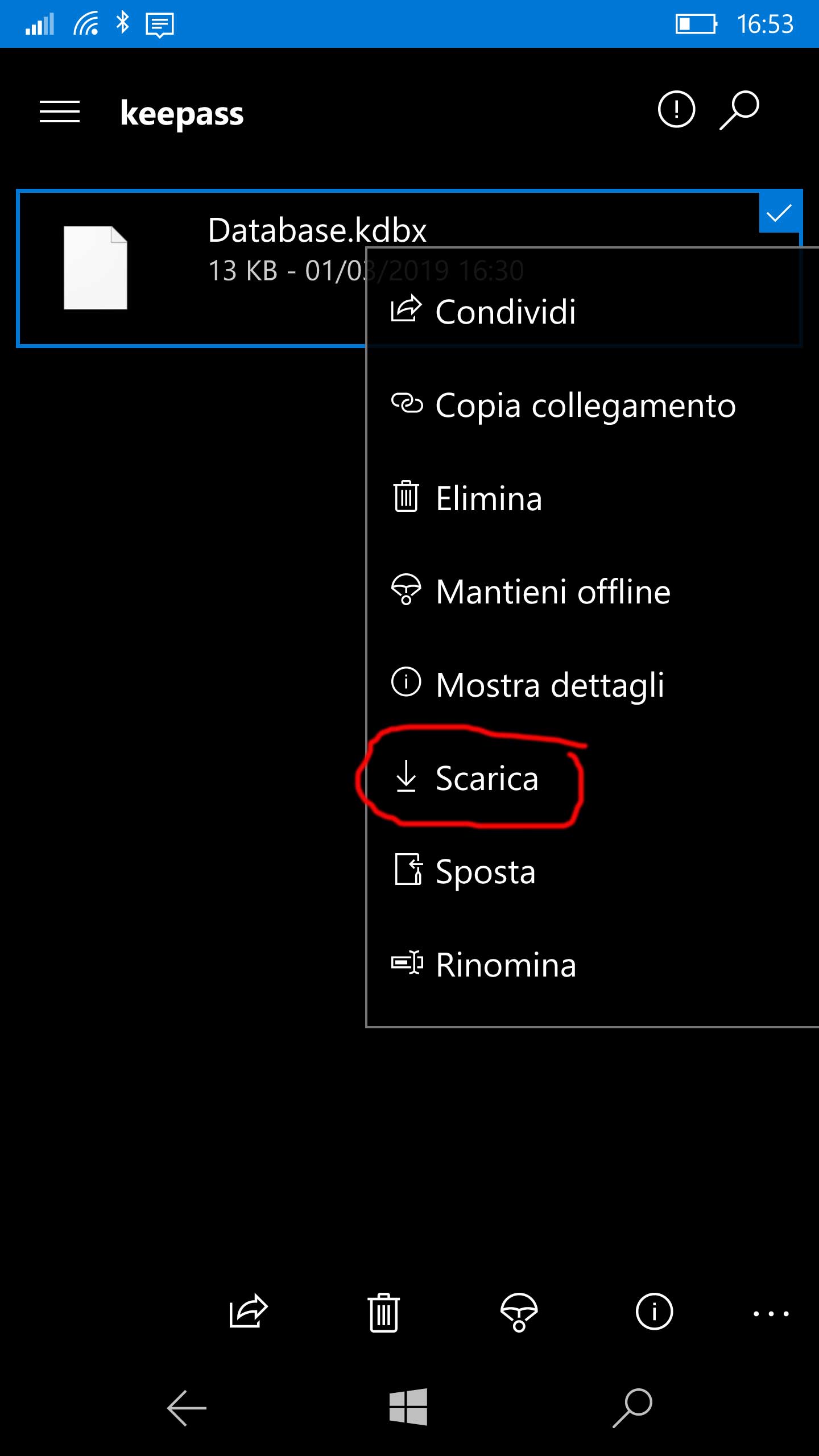 So, to update the DB in my Windows 10 Mobile smartphone with the version on OneDrive, I had to do it manually: I downloaded from that cloud the Database.kdbx file and, for example, I saved it in the local This device/Documents folder, so I could open it with the KeepPass app I installed on the smartphone.