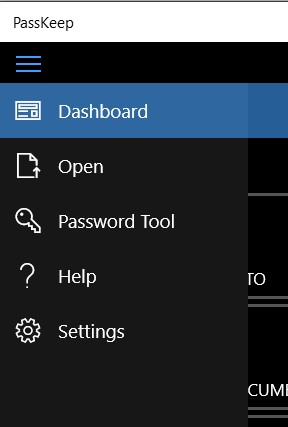 PassKeep app on Windows has the following very friendly user interface. The last opened database.kdbx is suggested, but you can open whatever kdbx file or create a new one.