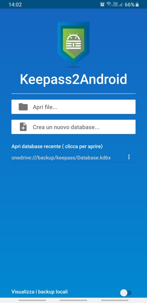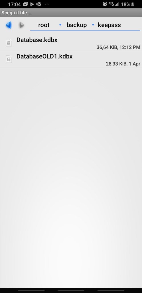On my Android phone, I installed the client Keepass2Android that is one of the many android apps compatible with KeePass format. Its interface is even better than the previous one. Also, in this case, the first thing to do is the insertion of the password you choose for the chosen kdbx file. By default, it tries to open the last used one, but you can close it and open a different file.