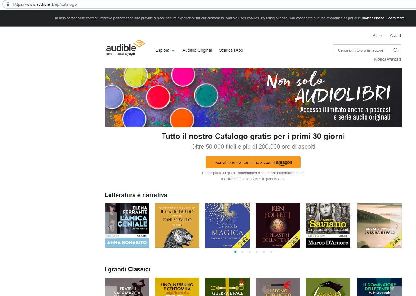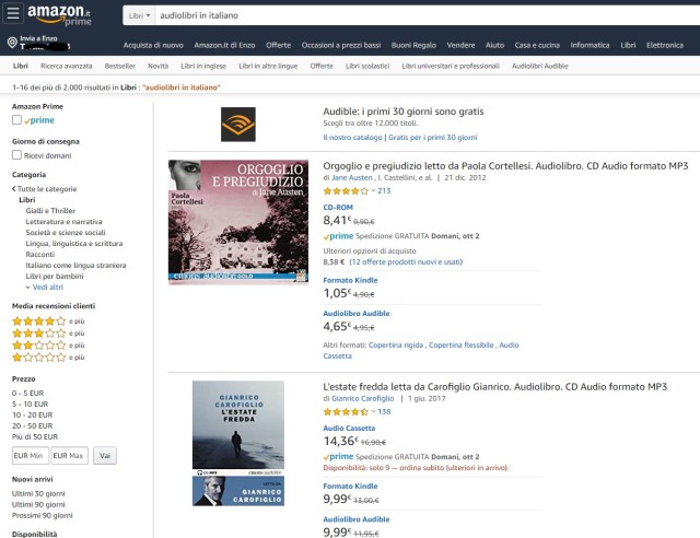 Ovviamente anche nella sezione libri dello store Amazon si posso acquistare singolarmente audiolibri a catalogo: ne vengono indicati più di 2000 in lingua italiana.
