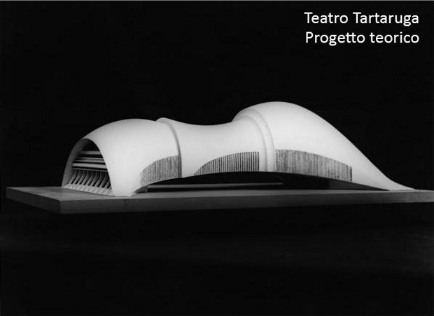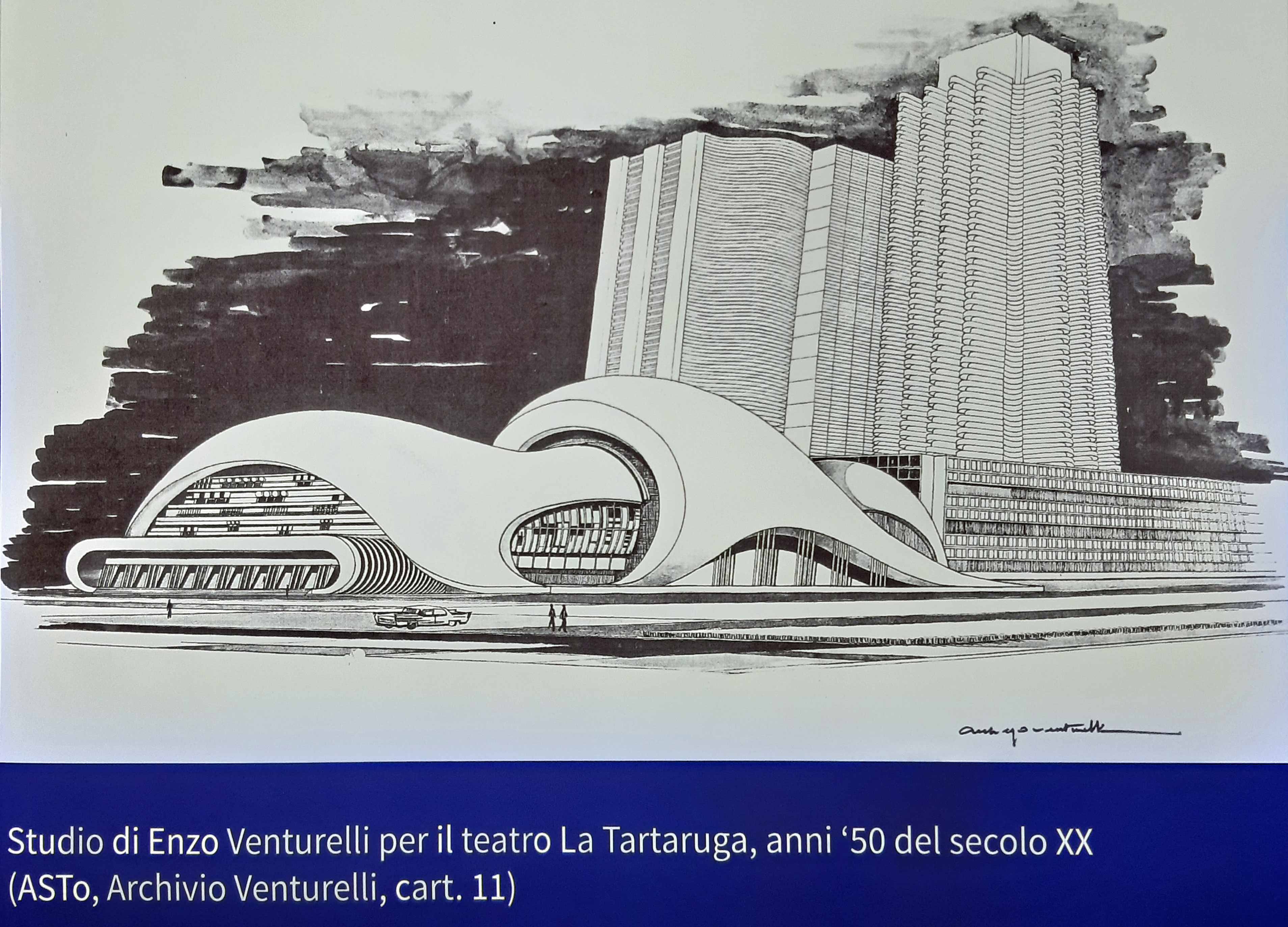 Nell’Archivio di Stato di Torino esiste una sezione apposita che contiene progetti di Enzo Venturelli. Nel seguito uno studio per il teatro La Tartaruga degli anni ’50’ che palesemente dimostra la grande creatività ed originalità di questo architetto torinese: (vedi sezione ArTO Sezione Corte | Archivi di famiglie e persone | Venturelli Enzo). Si tratta ci carteggio, disegni e materiale vario (in tutto 184 pezzi) che attualmente non risulta ancora digitalizzato e quindi non è disponibile sul sito dell’archivio. Questo materiale meriterebbe di essere esposto durante una delle mostre che periodicamente l’archivio organizza e rende visibili gratuitamente, così come è avvenuto recentemente, il 13/10/2019, quando ho potuto fotografare (da un tabellone appeso sul muro di un corridoio) il seguente disegno dell’architetto, relativo ad un suo studio per il teatro La Tartaruga degli anni ’50 e mai realizzato: in fondo al post riporto alcuni dei disegni contenuti nella cartella 4 di quell’archivio, pubblicati in una tesi disponibile online.