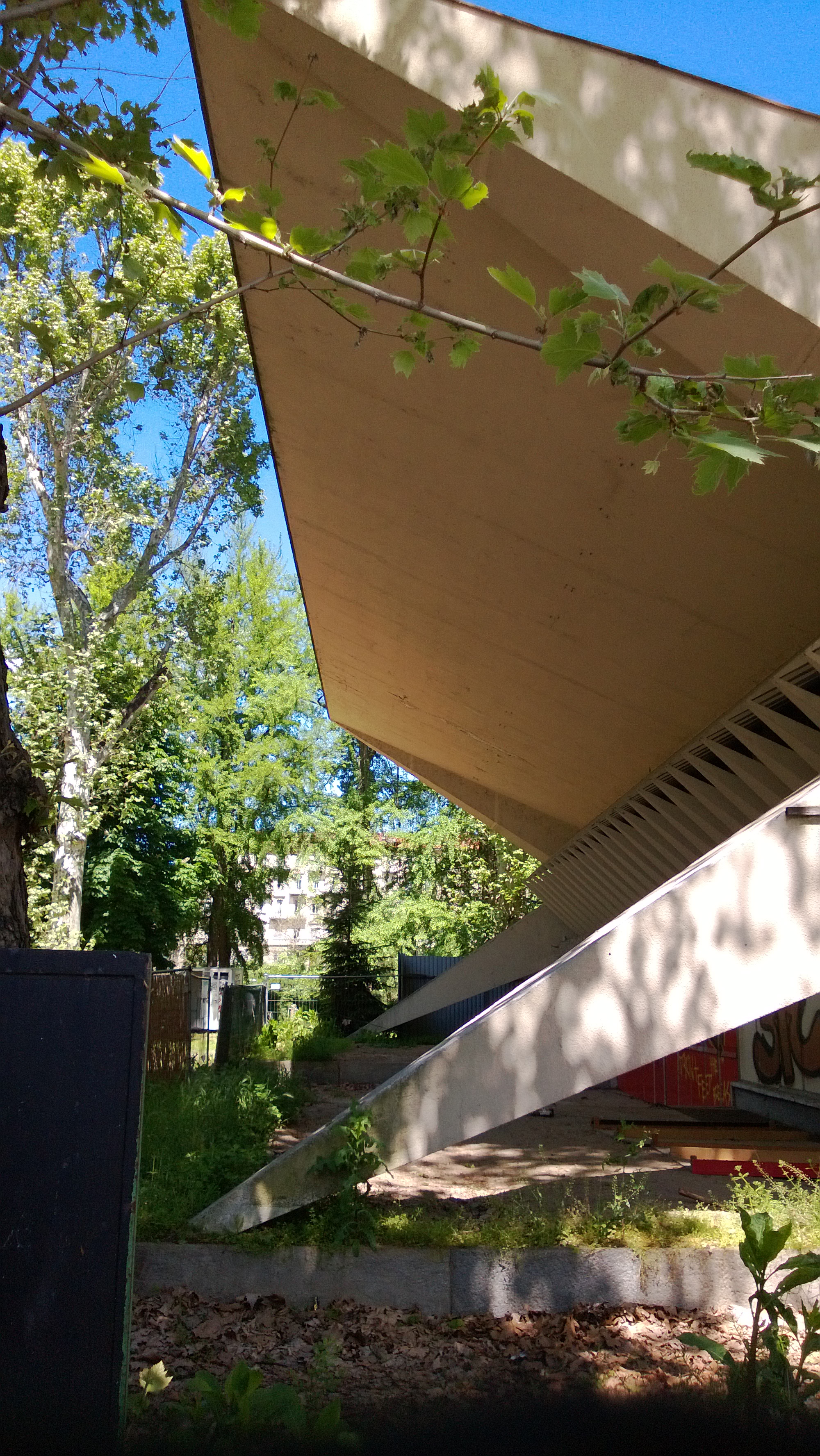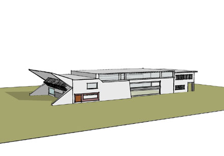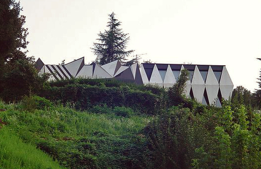 e al tempo stesso sviluppano un prevedibile gioco di chiaroscuri che dovrebbero venir contrapposti dagli spacchi laterali che modulano le pareti curve dell’intero involucro. Esiste in tutto questo, percepibile ad una visione dall’alto, una simmetria ben definita, incerta all’ipotetico osservatore posto al piano di campagna.