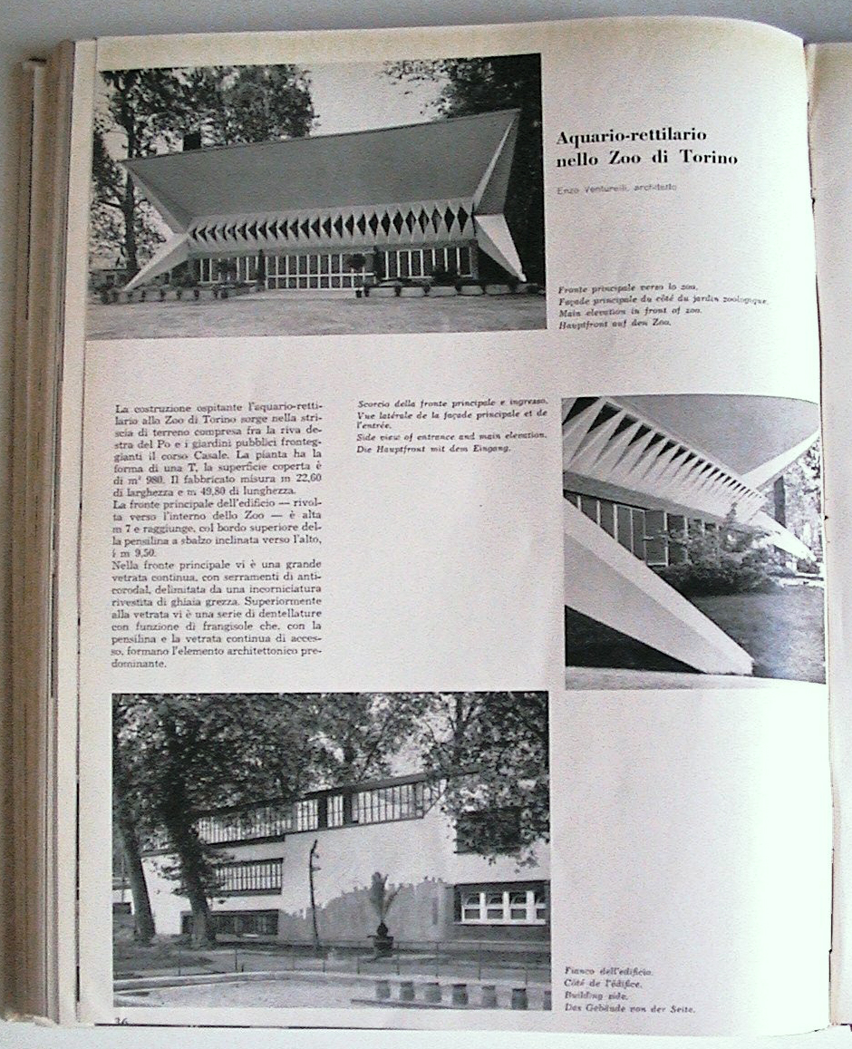 L’acquario rettilario, opera del 1960, ha nell’ingresso un chiaro riferimento zoomorfico tanto che la recensione apparsa su”Architettura, cronache e storia” fu titolata: “Moby Dick a Torino”.