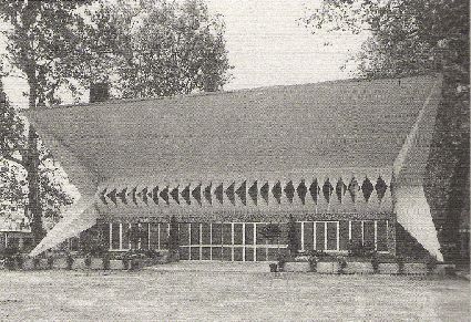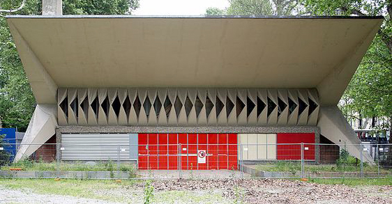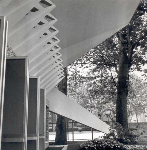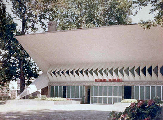 dell’amico scultore Umberto Mastroianni e con l’acquario-rettilario del giardino zoologico Venturelli concretizza i propri concetti spaziali delle dinamiche volumetriche, del gioco plastico e dell’asimmetria dinamica fondati “su una visione artistico-idealista dell’architettura” che, con superficialità, da