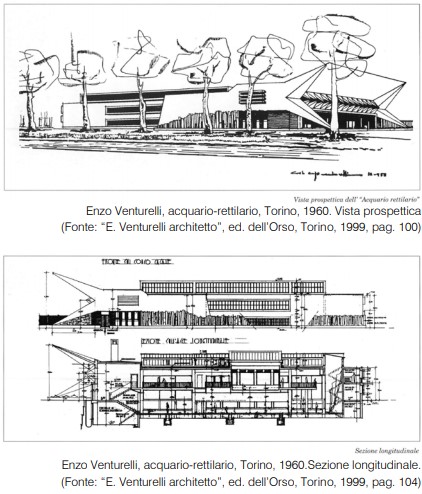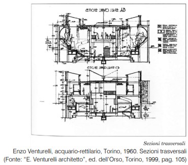 interni. Essi vengono studiati per proporre al visitatore una migliore visione degli organismi subacquei e per permettere una migliore percezione degli ambienti in cui si svolge la vita animale. Al fine di incantare il visitatore facendolo ritrovare come immerso all’interno di un mondo fiabesco, Venturelli progetta un ribassamento del piano dell’acqua rispetto al piano esterno del terreno che facilita la visione più studiata dell’acquario, mentre il rettilario è posto ad un piano relativamente più alto rispetto al piano di campagna, cosicché tra luci che vi giungono dall’alto, luci che provengono dalla facciata principale e la scansione dei piani. Questa caratteristica permette una percezione dei mondi animali senza che vi siano interruzioni di piani per la continuità delle vetrate, così che l’interno dell’edificio appare al visitatore non chiuso sul fondo, ma circondato da varie scenografie acquatiche.