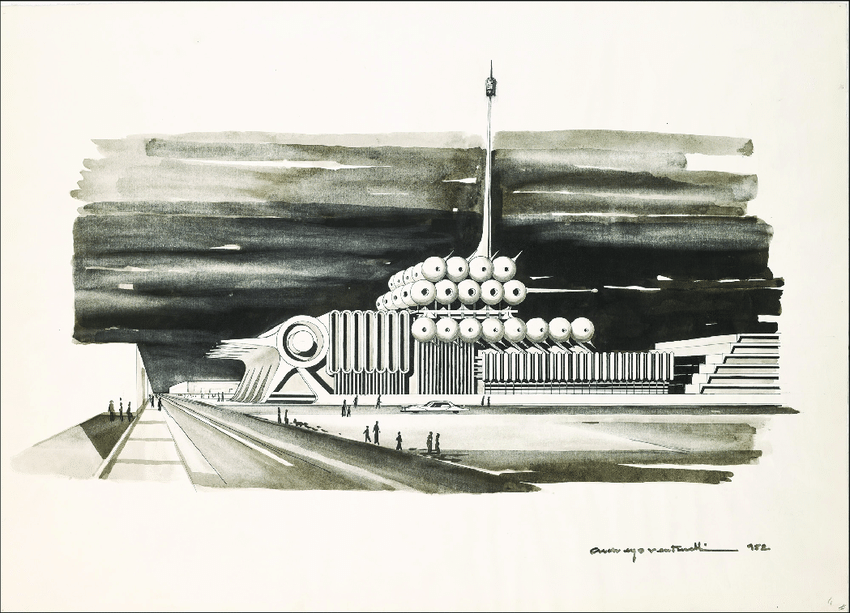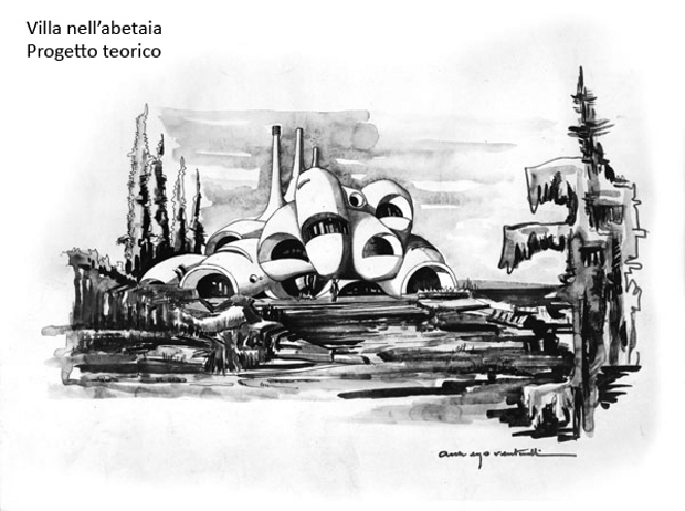 Spettacolare è questo disegno a china e inchiostri colorati di Enzo Venturelli, che ritrae il medesimo progetto sotto un’altra prospettiva: