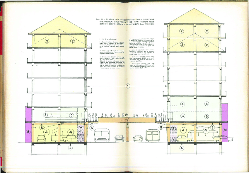 Il traffico pedonale si svolgerà al primo piano e quello dei veicoli al suolo urbano. Per ottenere la liberazione delle aree urbane di proprietà privata che dovranno essere adibite unicamente al traffico e ai servizi pubblici, occorrerà che i Comuni, previo censimento delle aree comprese nelle zone dei futuri ampliamenti urbani periferici, con la stesura di un nuovo Piano Regolatore, stabiliscano che le aree predette adibite a costruzioni urbane si trasformino, da aree di proprietà privata, unicamente in “diritti di costruzione”; diritti da esercitarsi in altezza a partire dal primo piano – o comunque dall’altezza minima di circa metri 5,50 dal piano del suolo – restando fermi i diritti alla cubatura costruibile consentita dagli attuali Regolamenti Edilizi”.