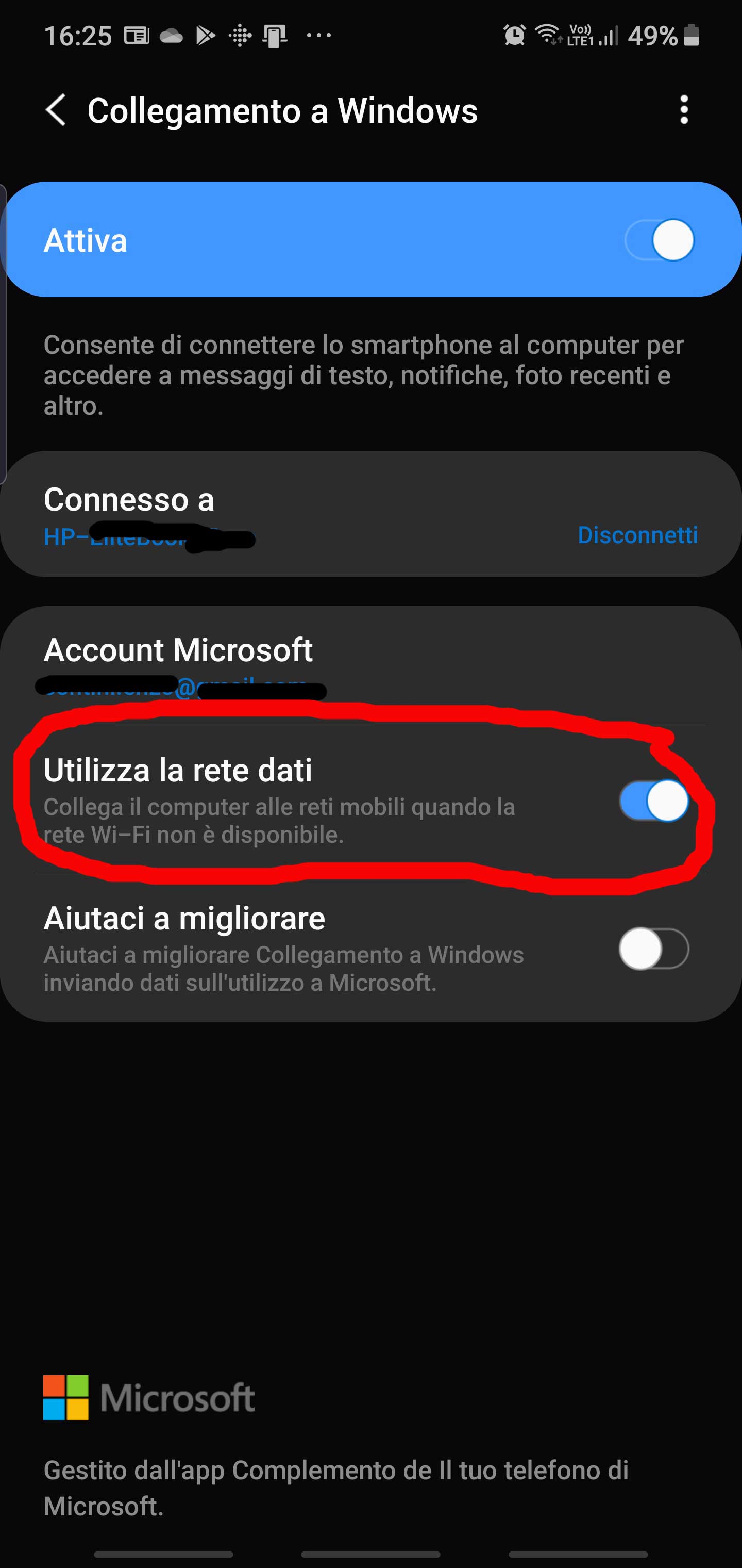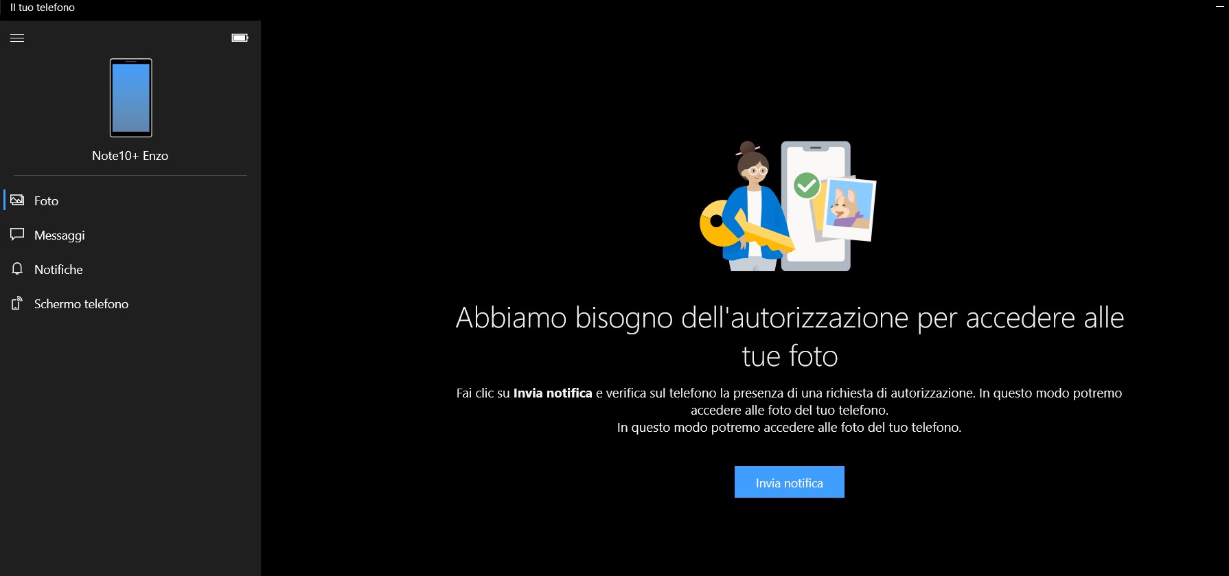 Note: the PC and the smartphone must be connected to the same WiFi or you need to go in the smartphone Settings -> Advanced features -> Windows connection and set the Use data network option (IT: Impostazioni -> Funzioni avanzate -> Collegamento a Windows – Utilizza la rete dati).