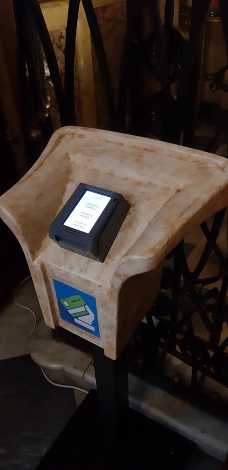 Davanti ad una delle cappelle laterali (la prima a destra), quella dedicata alla Madonna, un display luminoso di un dispositivo elettronico (sorretto da un orrendo supporto probabilmente in finto marmo, su cui è appiccicato un adesivo con l’immagine di una carta di credito) presenta le tre seguenti opzioni: