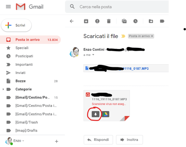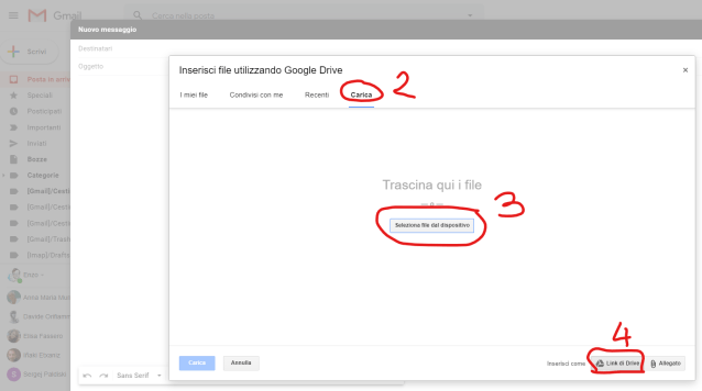 L’accesso a GoogleDrive può poi anche avvenire indirettamente anche cercando d’inviare una email con Gmail e selezionando l’icona di GoogleDrive dal menu in basso:Chi riceverà quella email, troverà il link per scaricare quel file reso disponibile dal mittente sulla sua area di GoogleDrive: