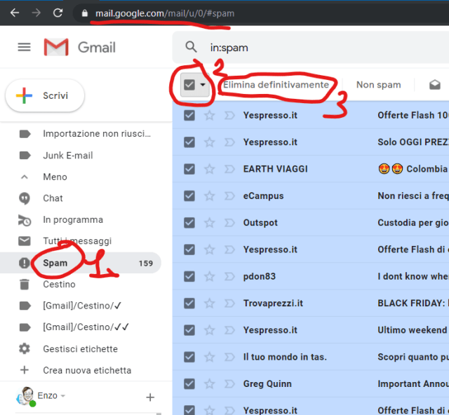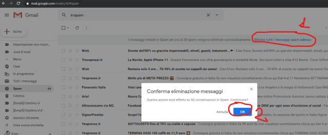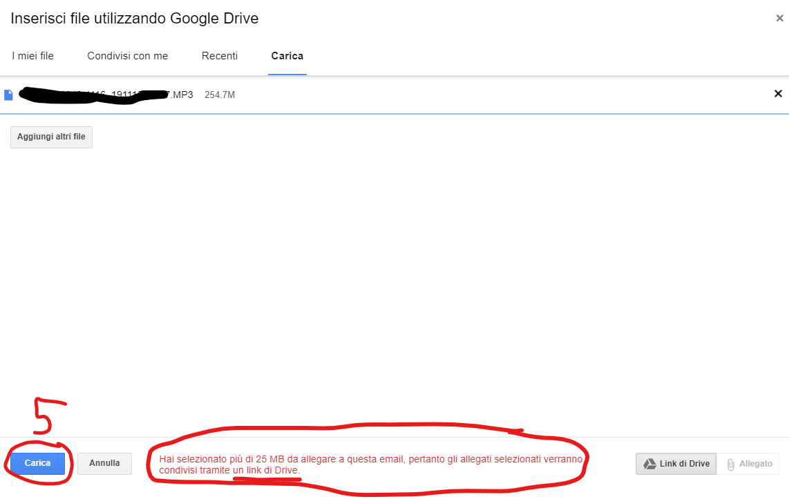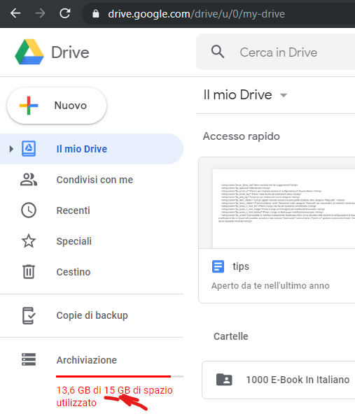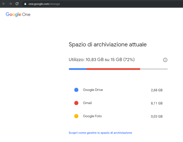 Si noti che i 15 GByte resi disponibili gratuitamente da Google per ciascun utente, buona parte possono già essere utilizzati in quanto condivisi sia da Gmail sia dal backup (e.g. foto) del proprio smartphone: può quindi convenire, se si necessita di più spazio per farci stare il file da condividere, effettuare un’azione di pulizia, partendo ad esempio dalle email identificate come spam se si usa Gmail (cancellate automaticamente di default solo dopo 30 giorni).