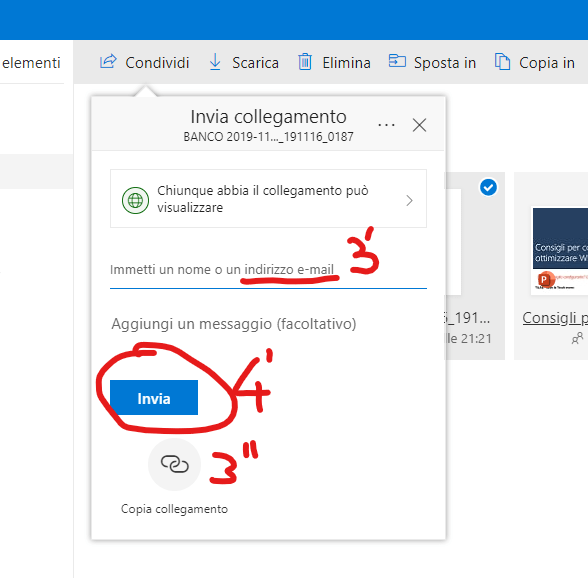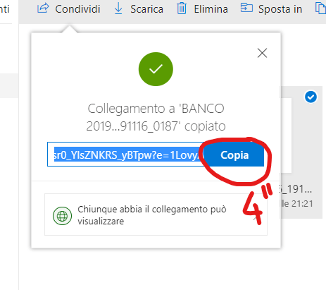Questo è il metodo più agevole che si può utilizzare sebbene si debba essere consapevoli che la condivisione viene offerta solo per un certo periodo (e.g. una settimana) che generalmente risulta comunque più che sufficiente per consentire alle persone a cui si intende inviare uno o più file di scaricarseli in locale.