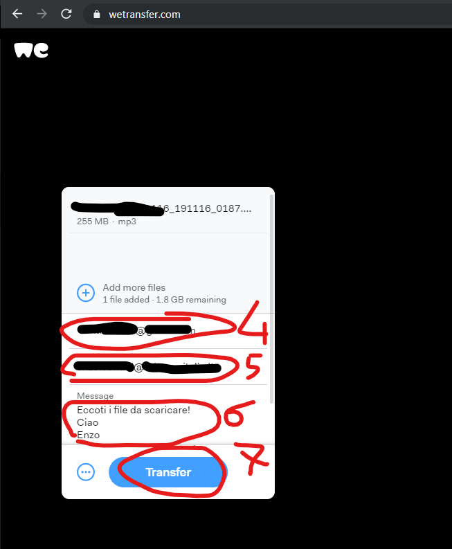 Nel seguito mostro, a titolo di esempio, i semplici passi da eseguire nel caso si utilizzi il servizio di WeTransfer: