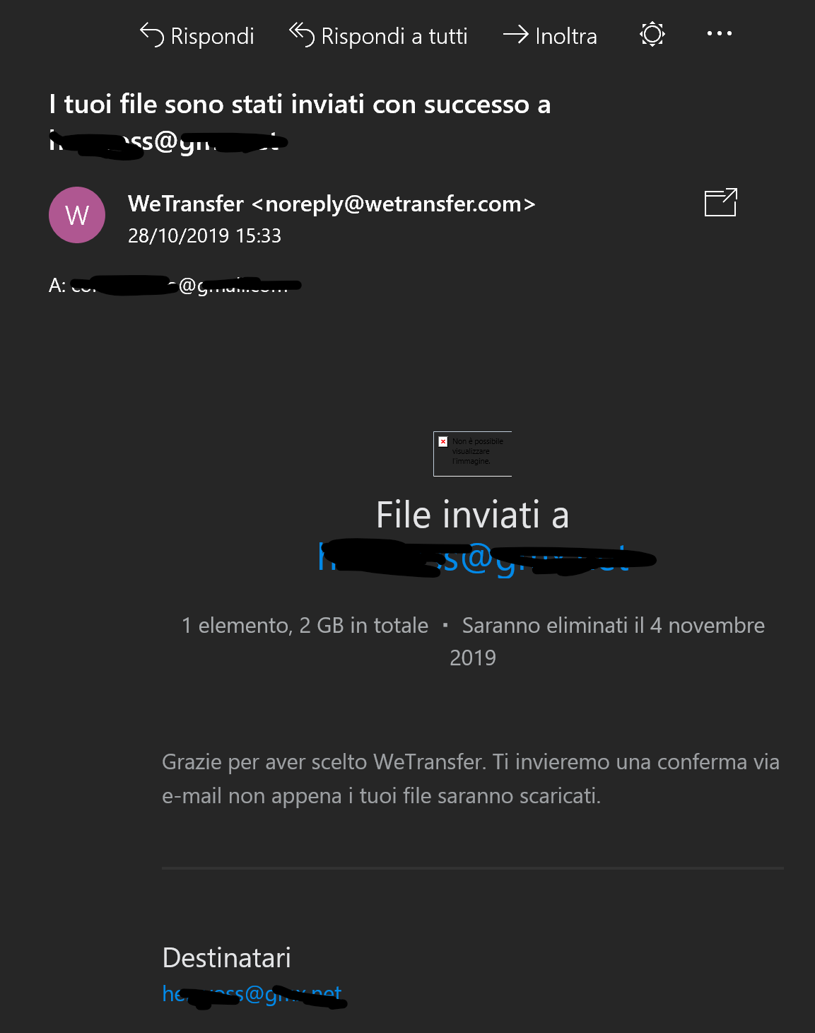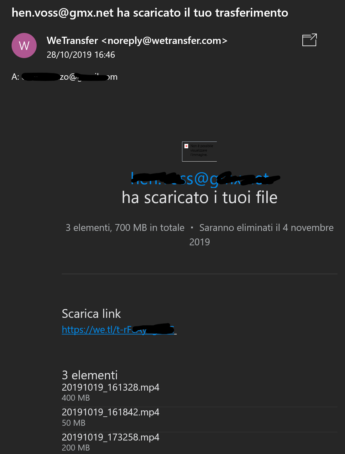 WeTransfer: trasferimento di uno o più file ad uno o più destinatari: costoro riceveranno una email con il link che consente di scaricarli entro un certo periodo di tempo (2)